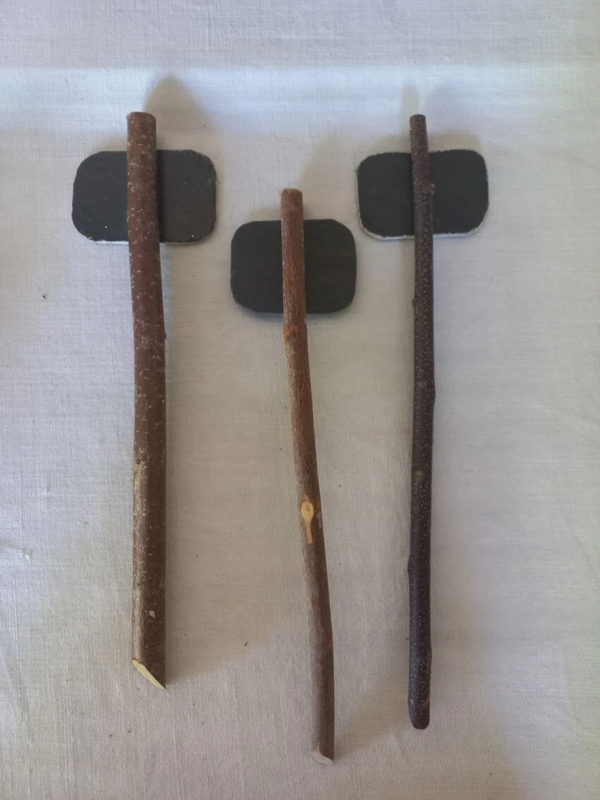 Fabrication artisanale: tuteur en châtaignier et ardoises anciennes peintes.