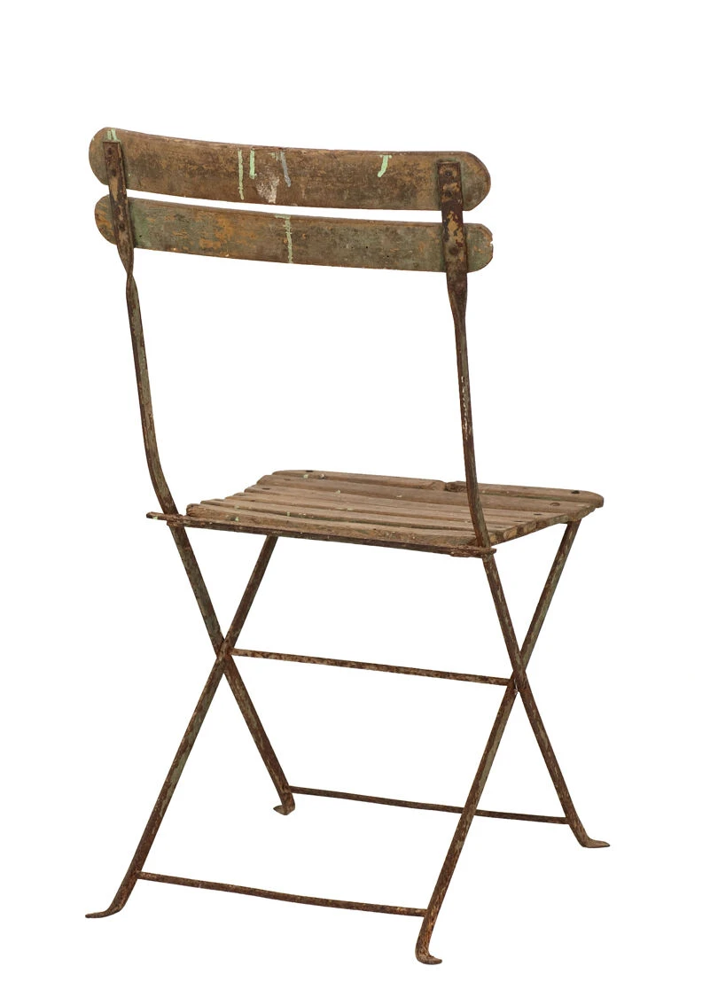 Charmante chaise de jardin ancienne, facile à plier, stable et solide malgré une réparation ancienne sur une latte, avec traces d’usage, à laisser nature ou à peindre.
