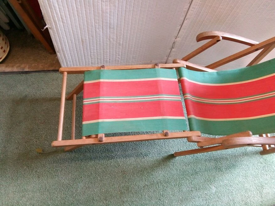 Ancienne chilienne enfant.modéle rare avec repose pieds et accoudoirs arrondis.elle est dans son jus avec sa toile d’origine.a signaler, une griffure sur la toile du repose pied qui peut se renforcer derriére avec une piece à appliquer au fer à repasser.(je peux le faire si on me le demande)la hauteur d’assise est environ de 28 cm.