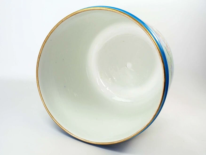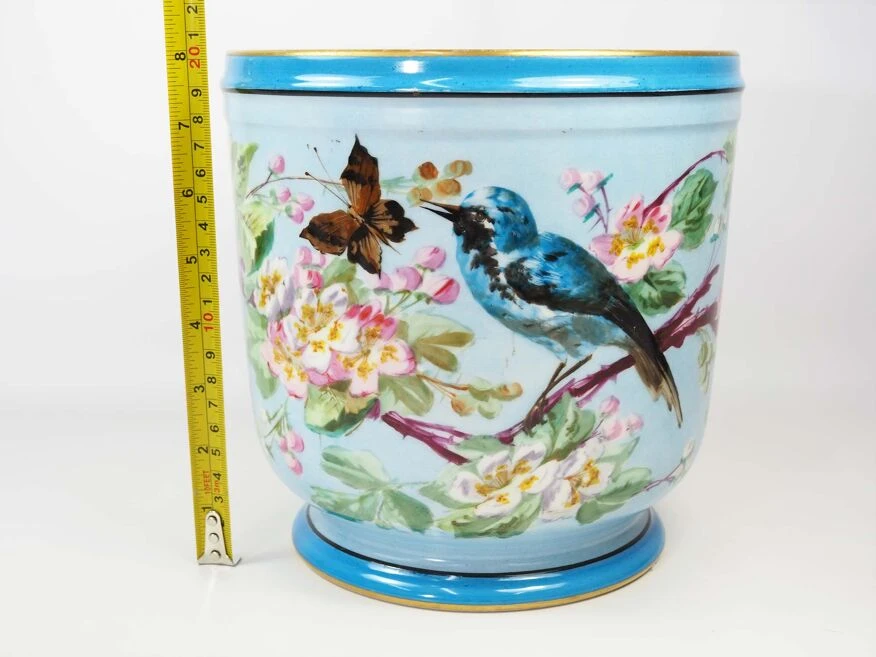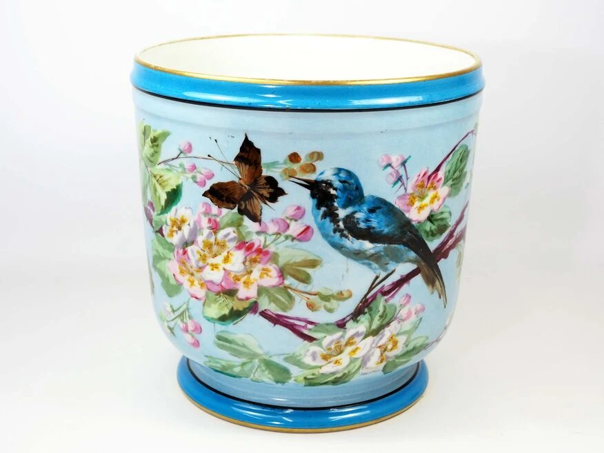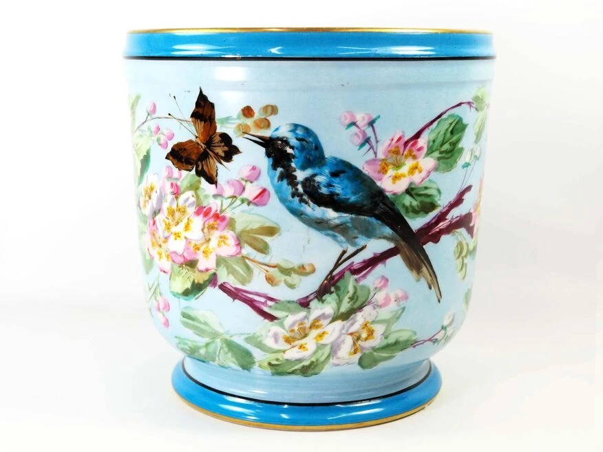 Ancienne jardinière en porcelaine française du xixe siècle peinte à la main, sur fond bleu turquoise avec un oiseau et un papillon sur une branche et des fleurs, qui symbolisaient à l’époque le printemps et le début d’une nouvelle vie.