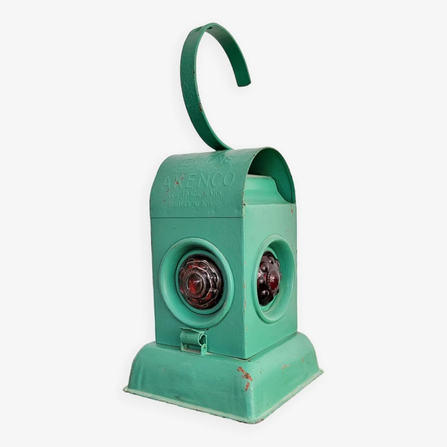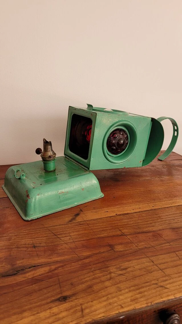 C’est donc une ancienne lampe à pétrole anglaise servant à l’origine de signalisation sur les voies ou les routes.