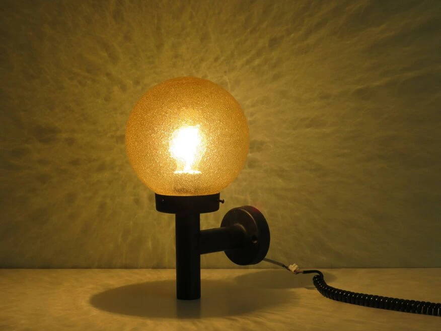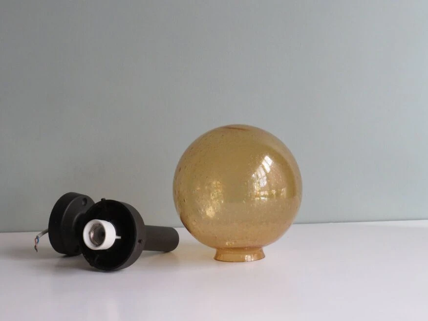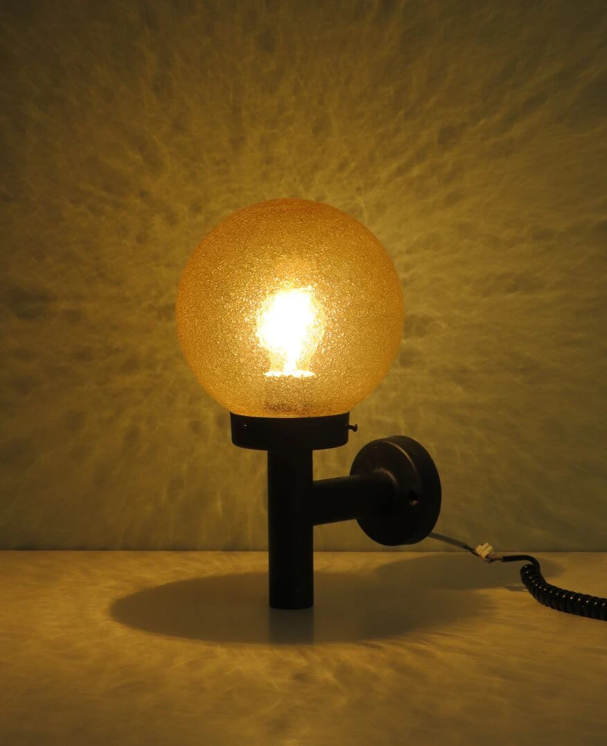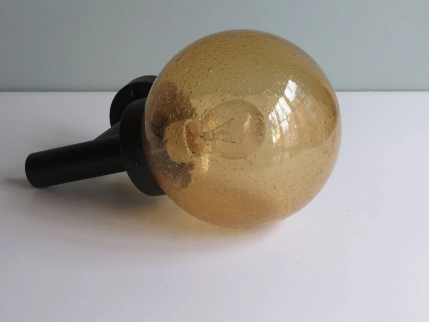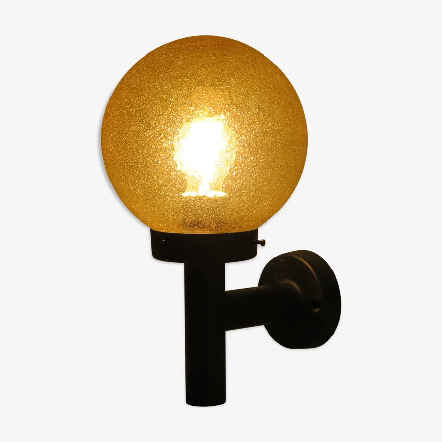 Lampe d’extérieur, cadre en plastique et verre jaune ocre avec bulles d’air.