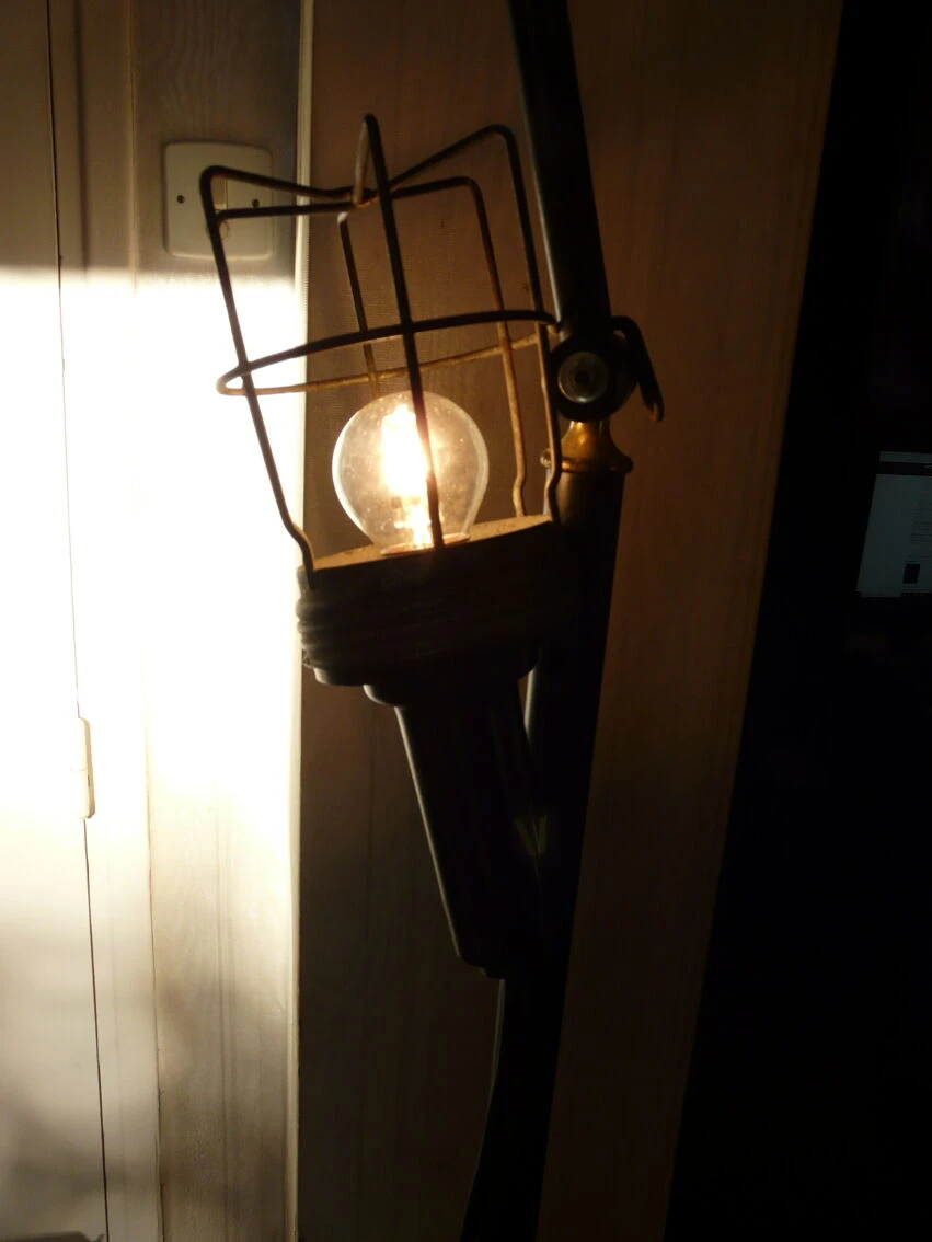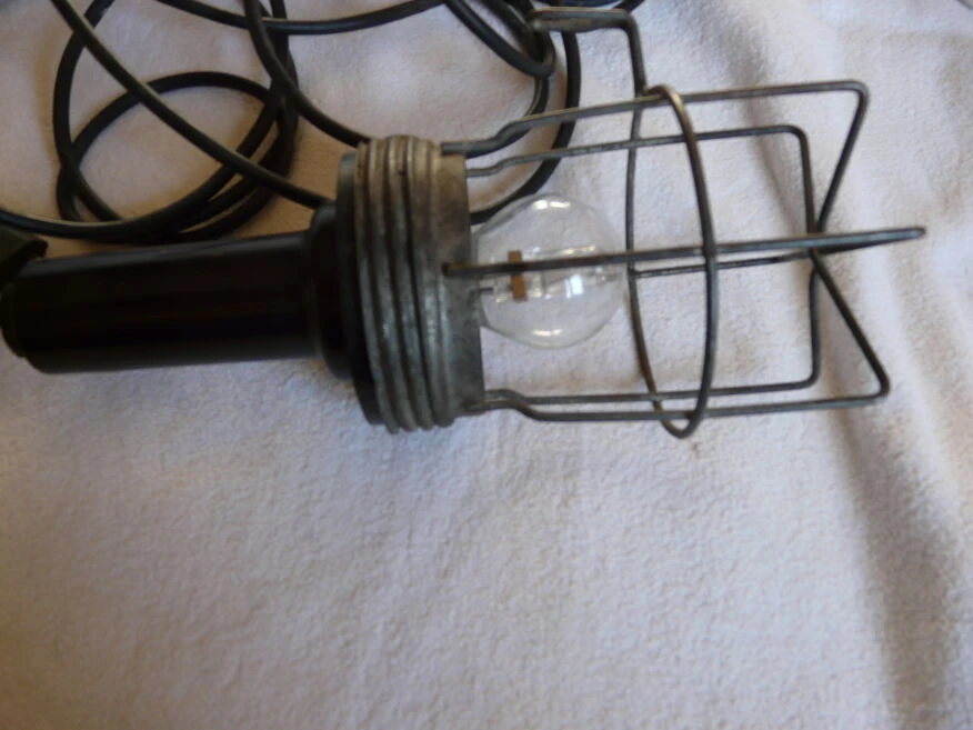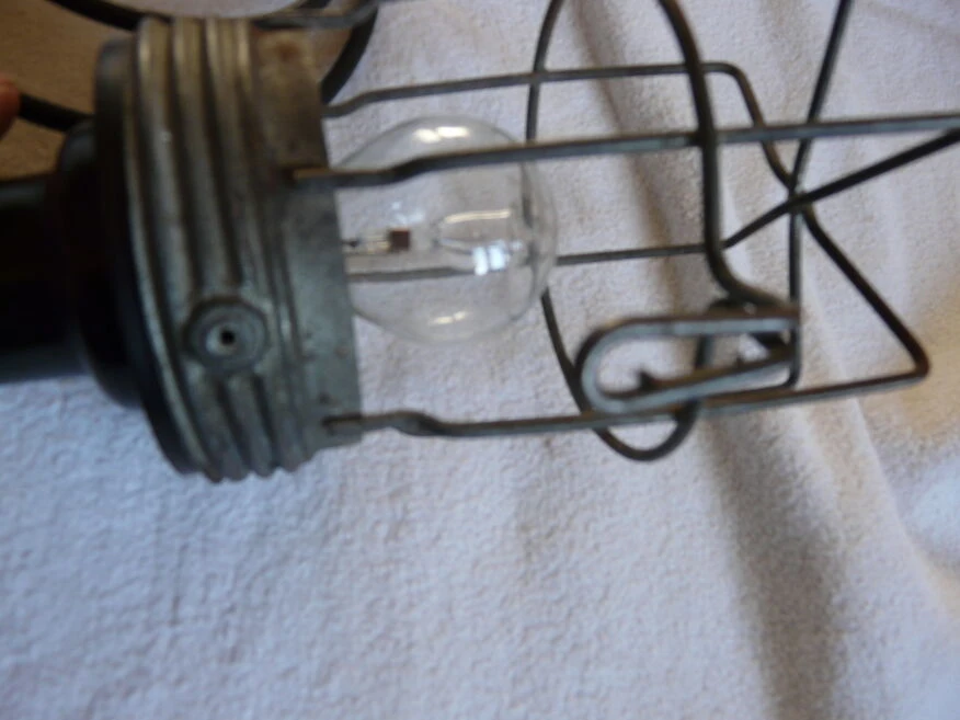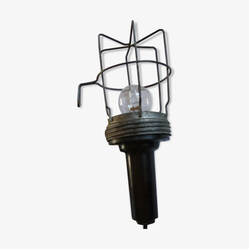 Ancienne baladeuse industrielle, d’usine, circa 1950 en bon état manche en bakélite .l elle fonctionne avec ampoule à baillonette fournie. Elle mesure 25cm de hauteur pour 8 de diamètre à son ouverture.