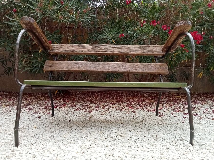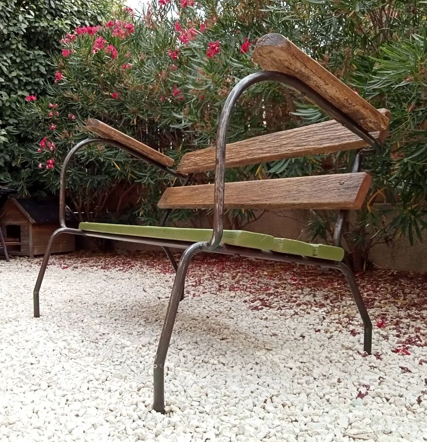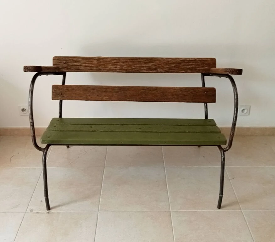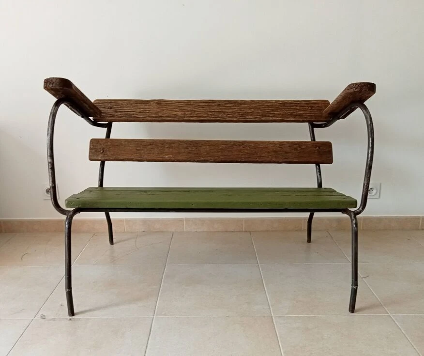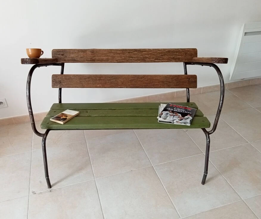 Superbe banc ancien estimée aux années 20/30, modèle très rare, design doté de jolies lignes, dossier, assise et accoudoirs inclinées qui offrent un agréable confort « décontracte », structure en acier tubulaire, assise dossier et accoudoirs en bois, la pièce a était rafraîchie, les parties en bois ont étaient légèrement poncées, accoudoirs et dossier vernis, assise peinte avec une agréable peinture de qualité vert « boisé », une sous couche a était passé au préalable.
