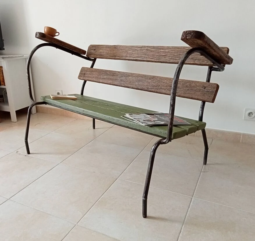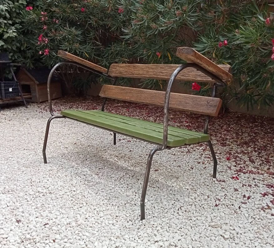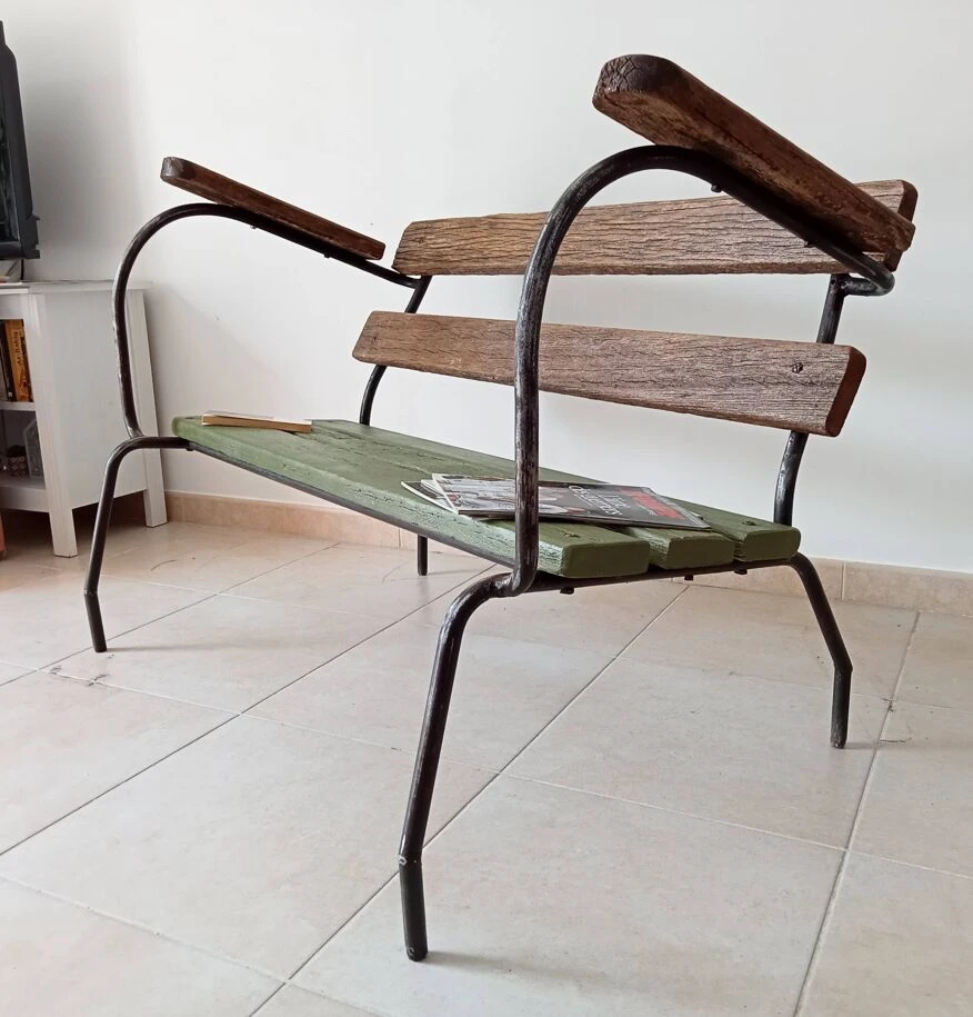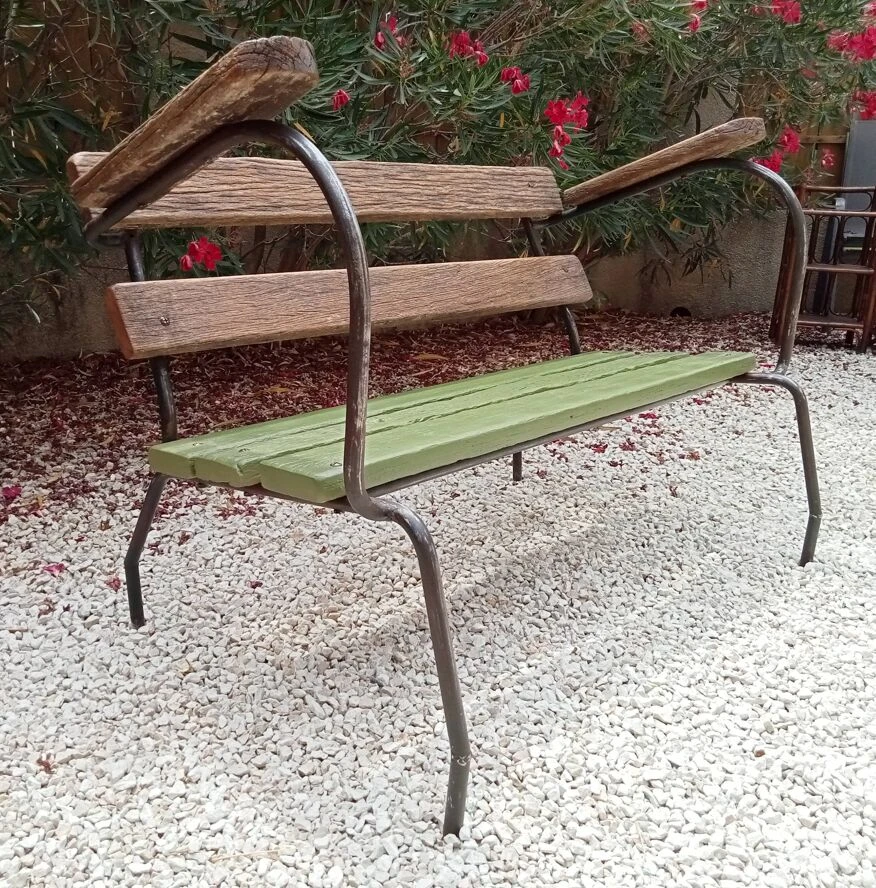 Superbe banc ancien estimée aux années 20/30, modèle très rare, design doté de jolies lignes, dossier, assise et accoudoirs inclinées qui offrent un agréable confort « décontracte », structure en acier tubulaire, assise dossier et accoudoirs en bois, la pièce a était rafraîchie, les parties en bois ont étaient légèrement poncées, accoudoirs et dossier vernis, assise peinte avec une agréable peinture de qualité vert « boisé », une sous couche a était passé au préalable.
