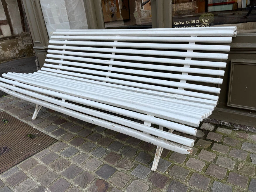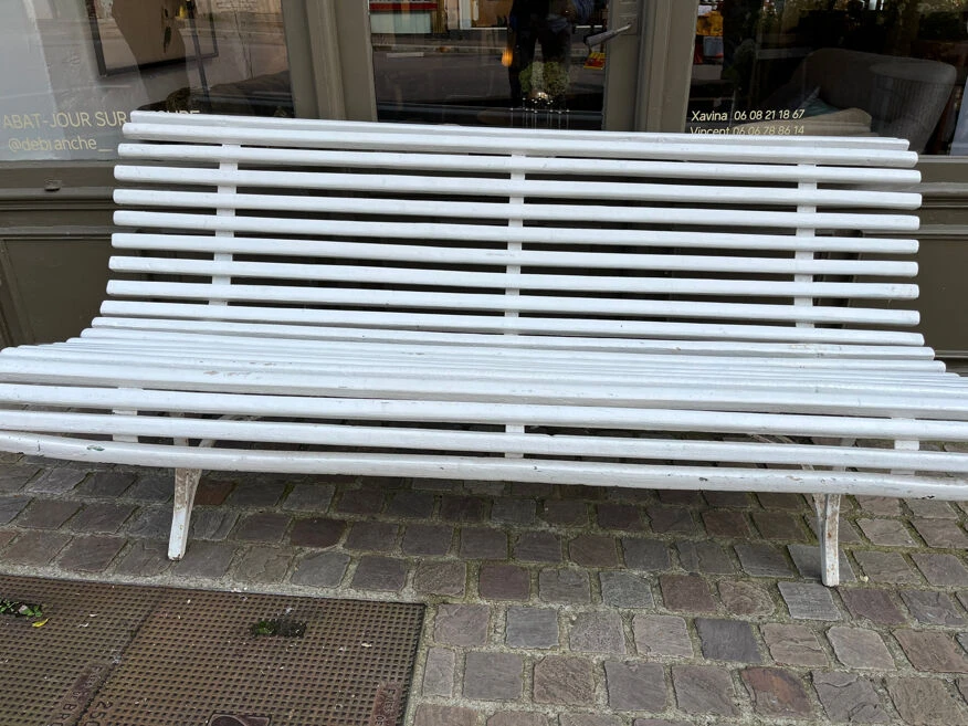 Beau banc de jardin de 1900 en bon état, patine d’origine quelques traces de couches successives de peinture afin de surmonter les saisons.bonne manufacture, à noter une latte très légèrement abîmée au bout en bas à droite, rien qui n’altère l’usage ni la solidité et la qualité du banc.