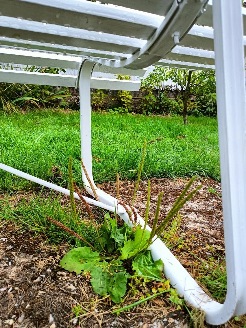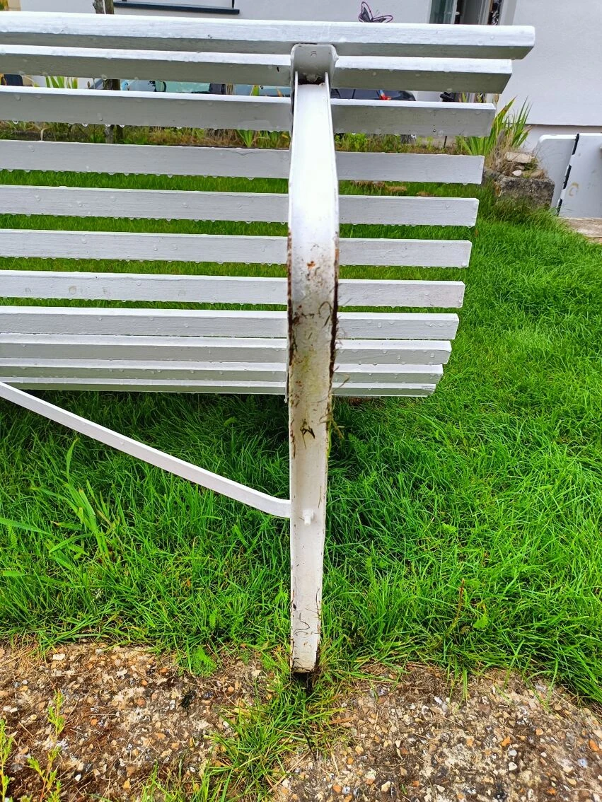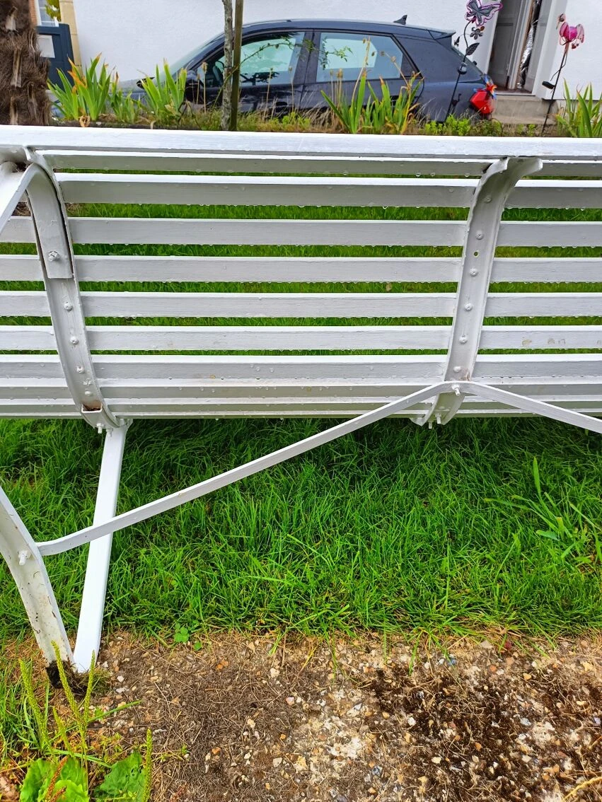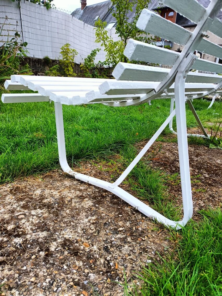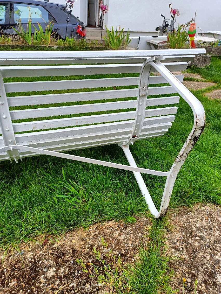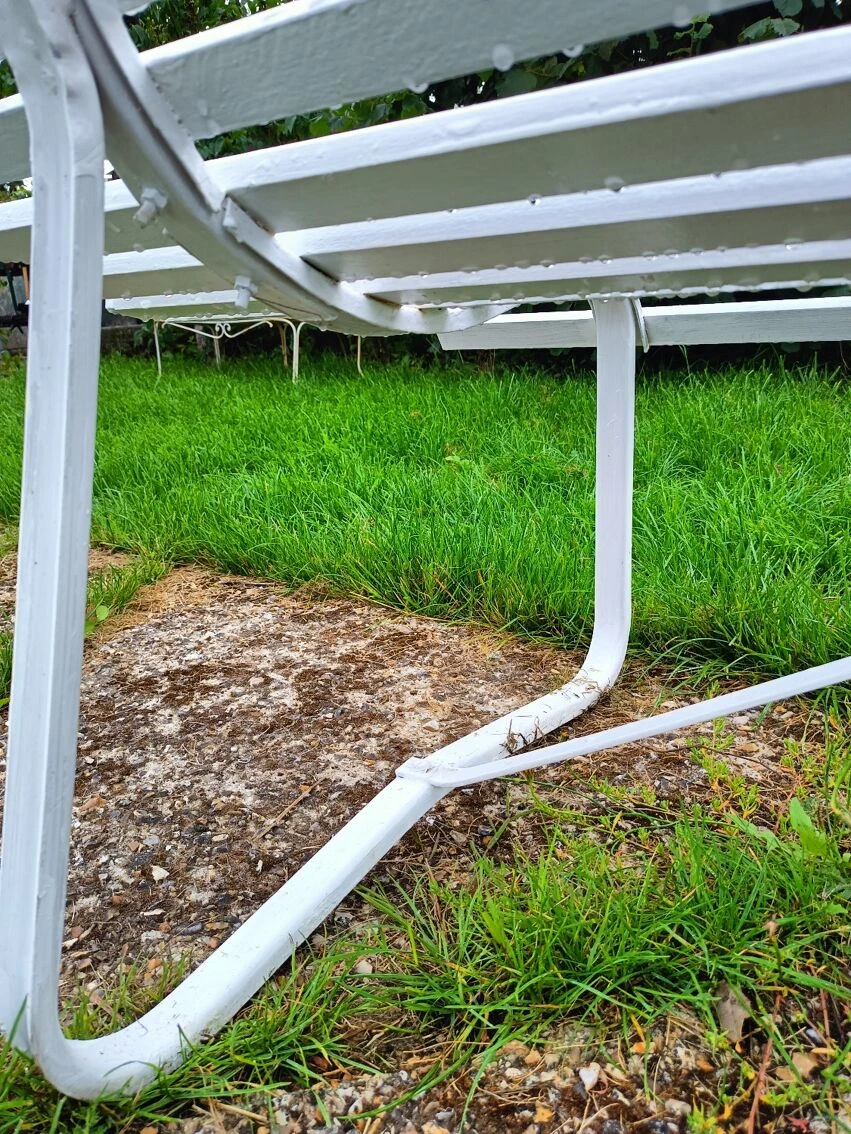 Piétement métallique sain, les piétements n’ont pas été réparés ( trace d’herbe sur les photos) et ils sont en très bon état.