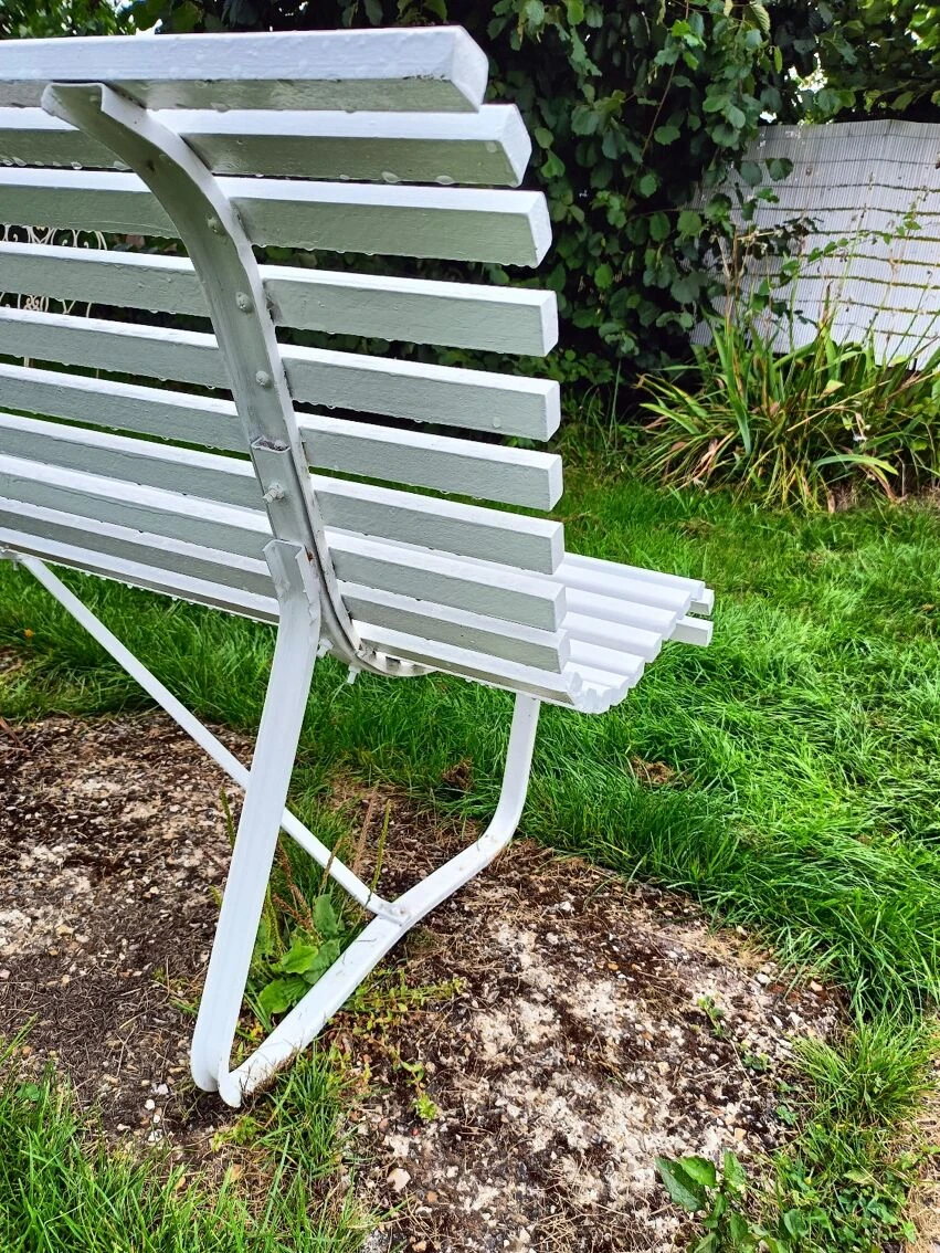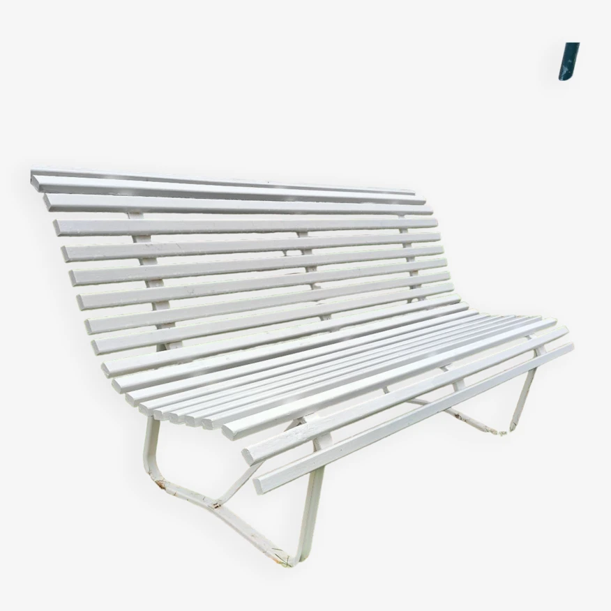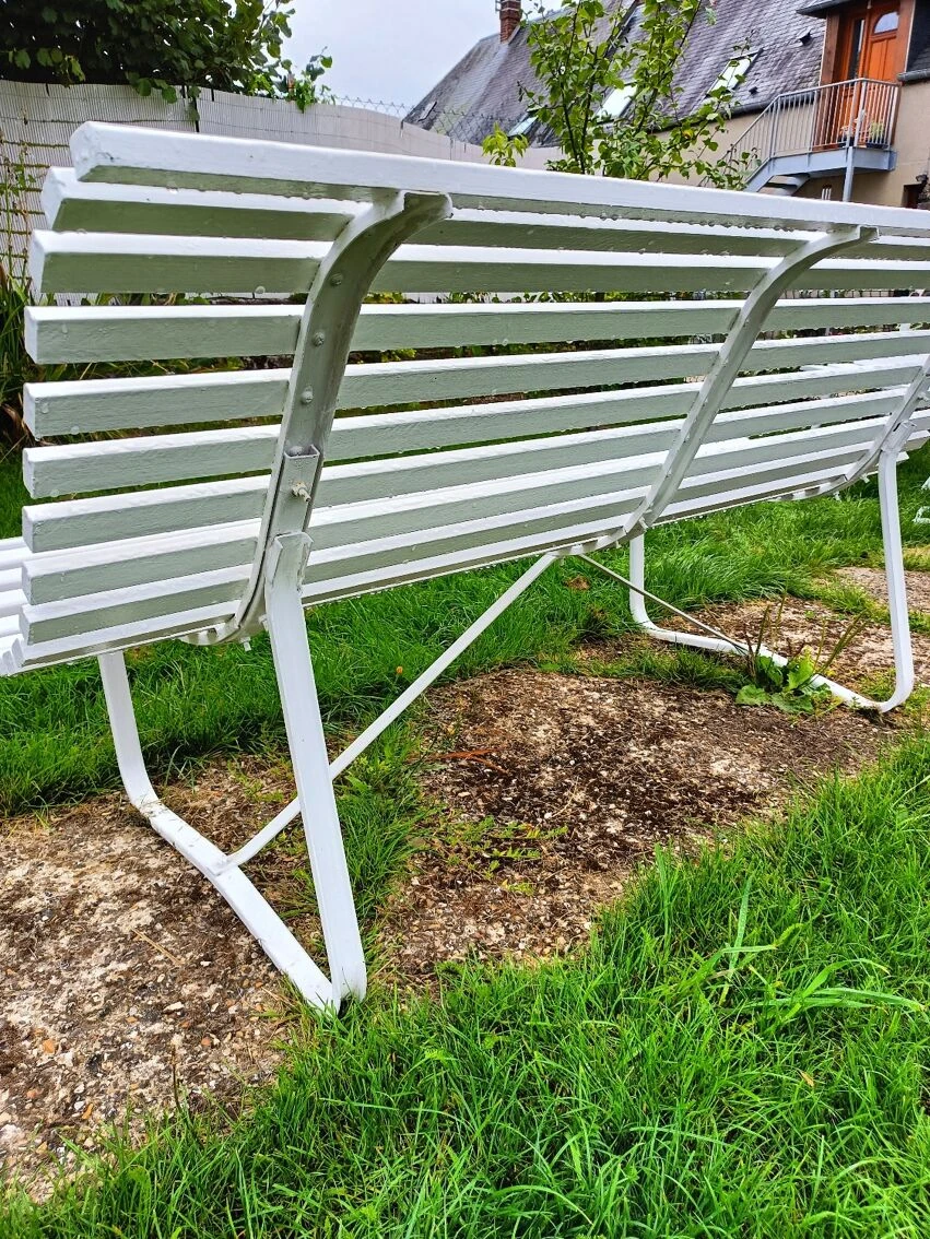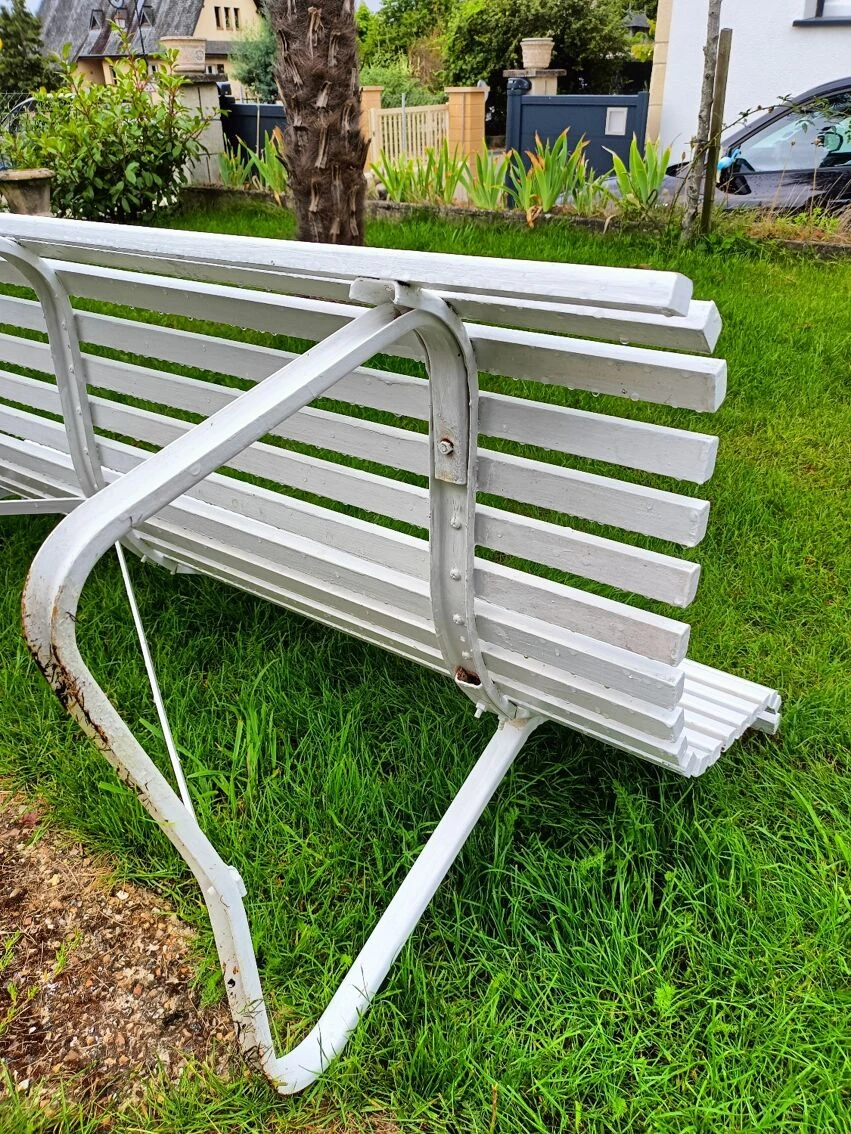 Mise en vente de ce banc de jardin avec lattes en bois et piétement métallique.