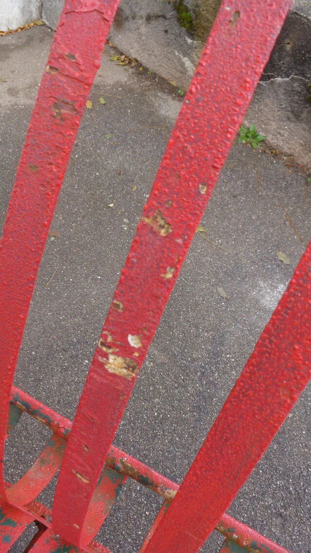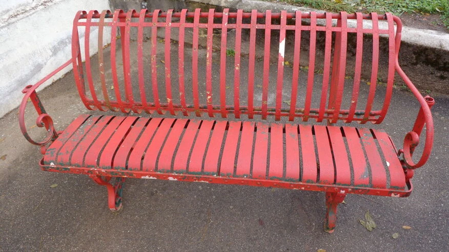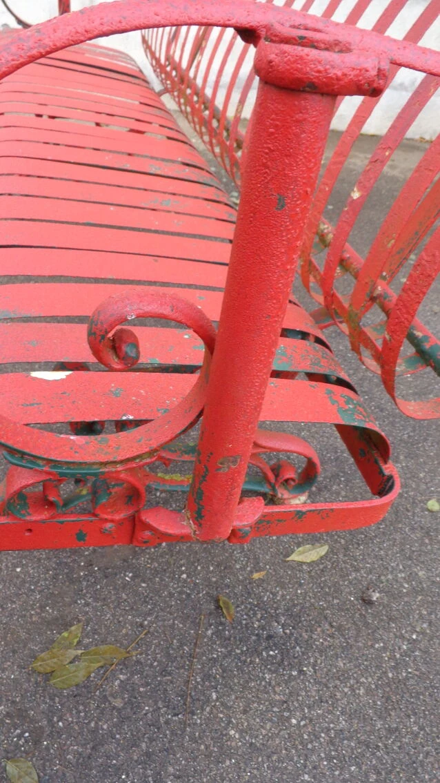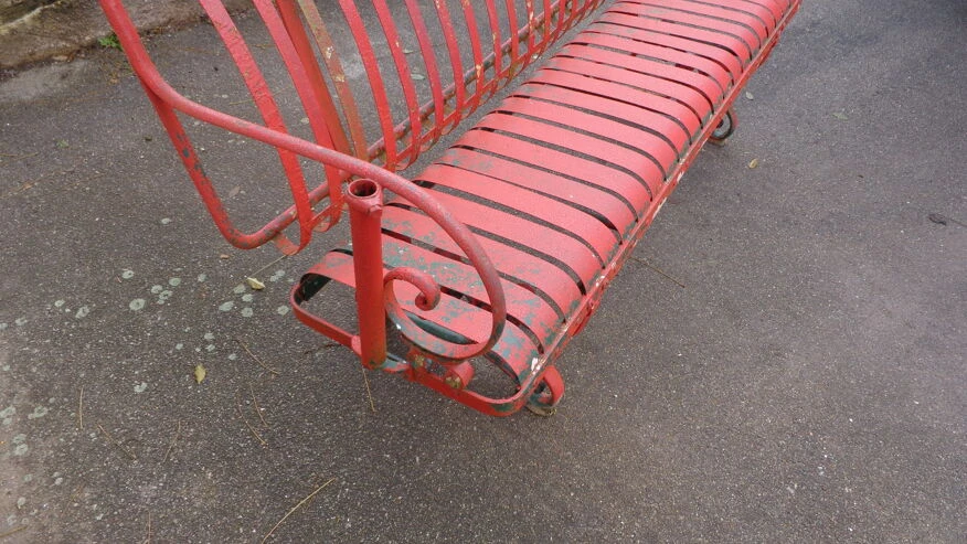 Banc possédant plusieurs couches de peinture, vert empire sous le rouge.