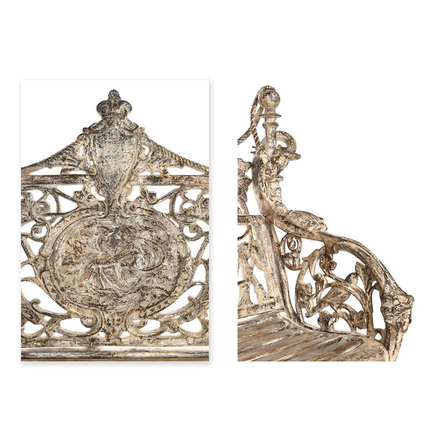 Banc en fonte sculptée et bois à patine blanche.