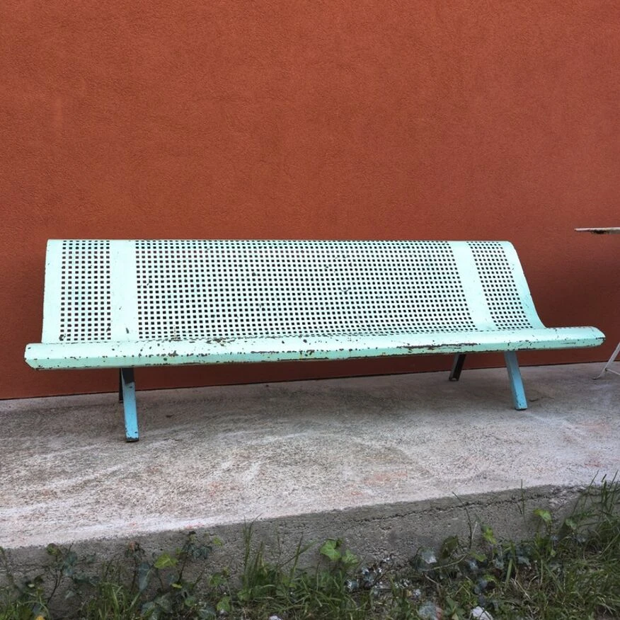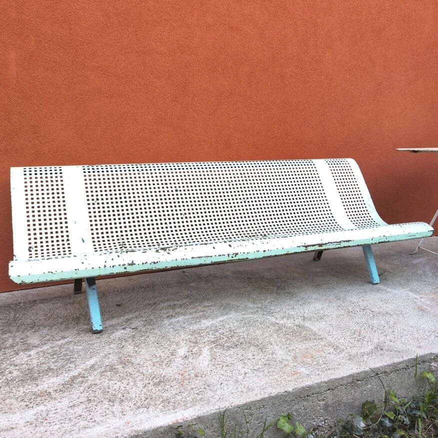 Banc public en fer perforé.