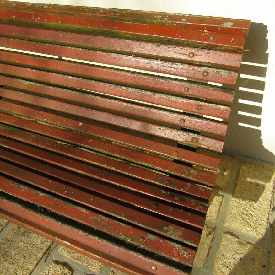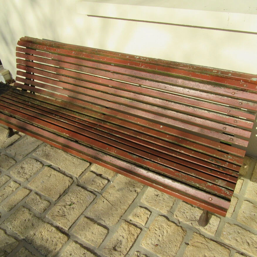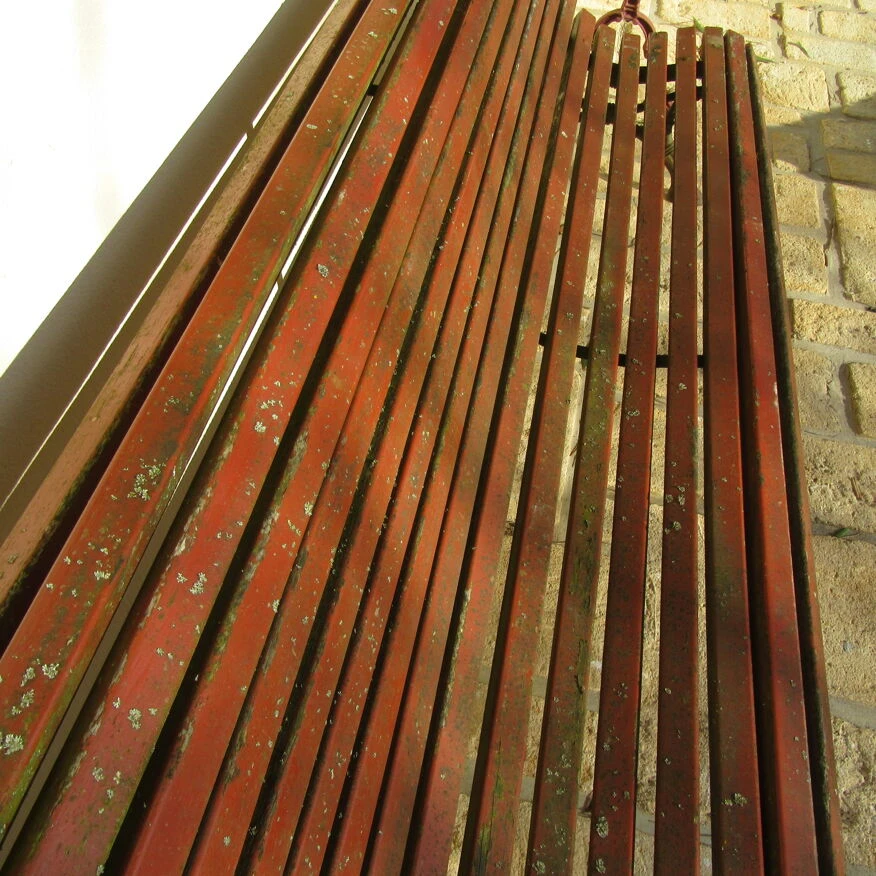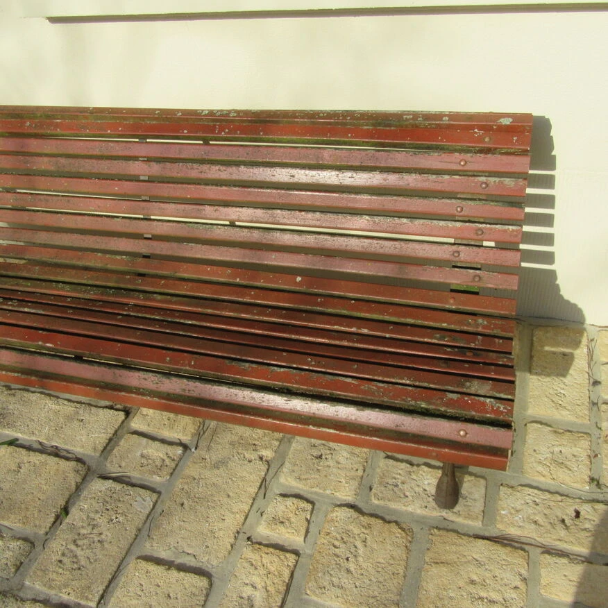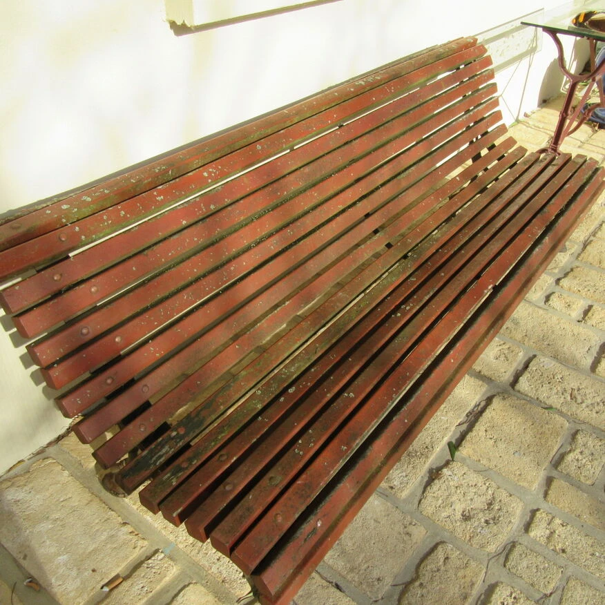 Pieds en fonte d’époque art nouveau de couleur noir. 18 lattes en bois exotique d’une épaisseur de 4cm avec une magnifique patine du temps.
