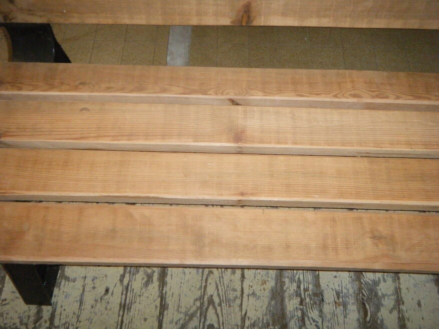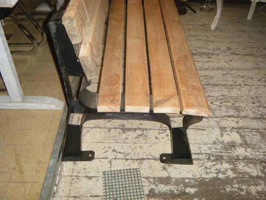 Ancien banc de jardin public, refait en pin, pieds en acier noir.il faudra le vernir pour le laisser à l’extérieur.la largeur de l’assise est de 44 cm.