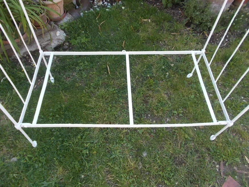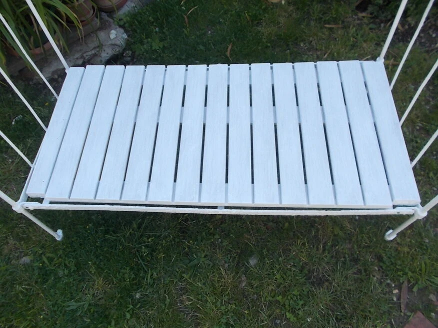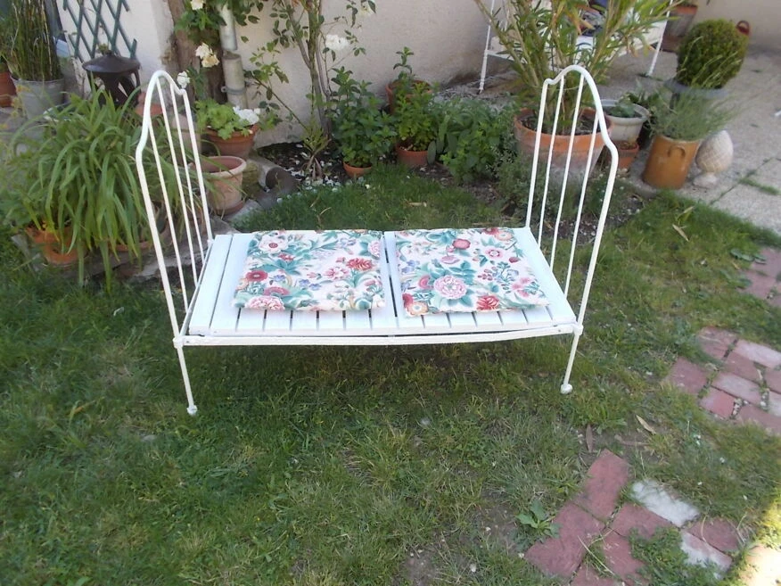 Sympathique petit lit en fer forgé pour servir de banquette et mettre dans votre jardin, jardin d’hiver ou salon bref partout.