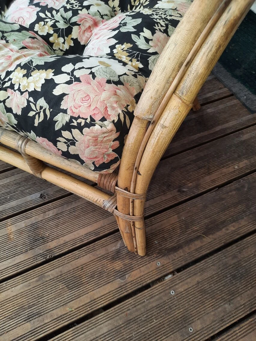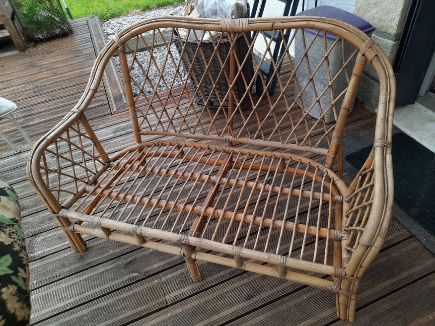 Banquette de jardin ou d’intérieur, bambou et rotin, vintage, avec ses coussins, très bon état et solide.