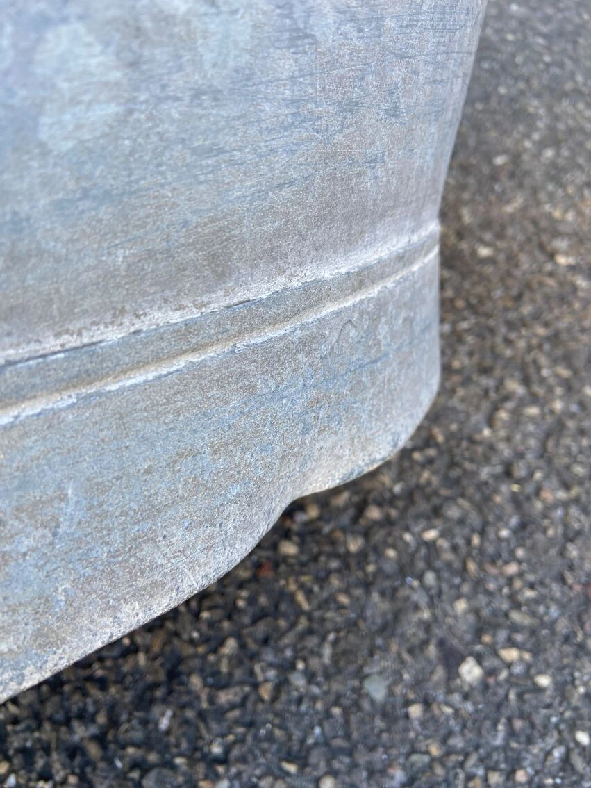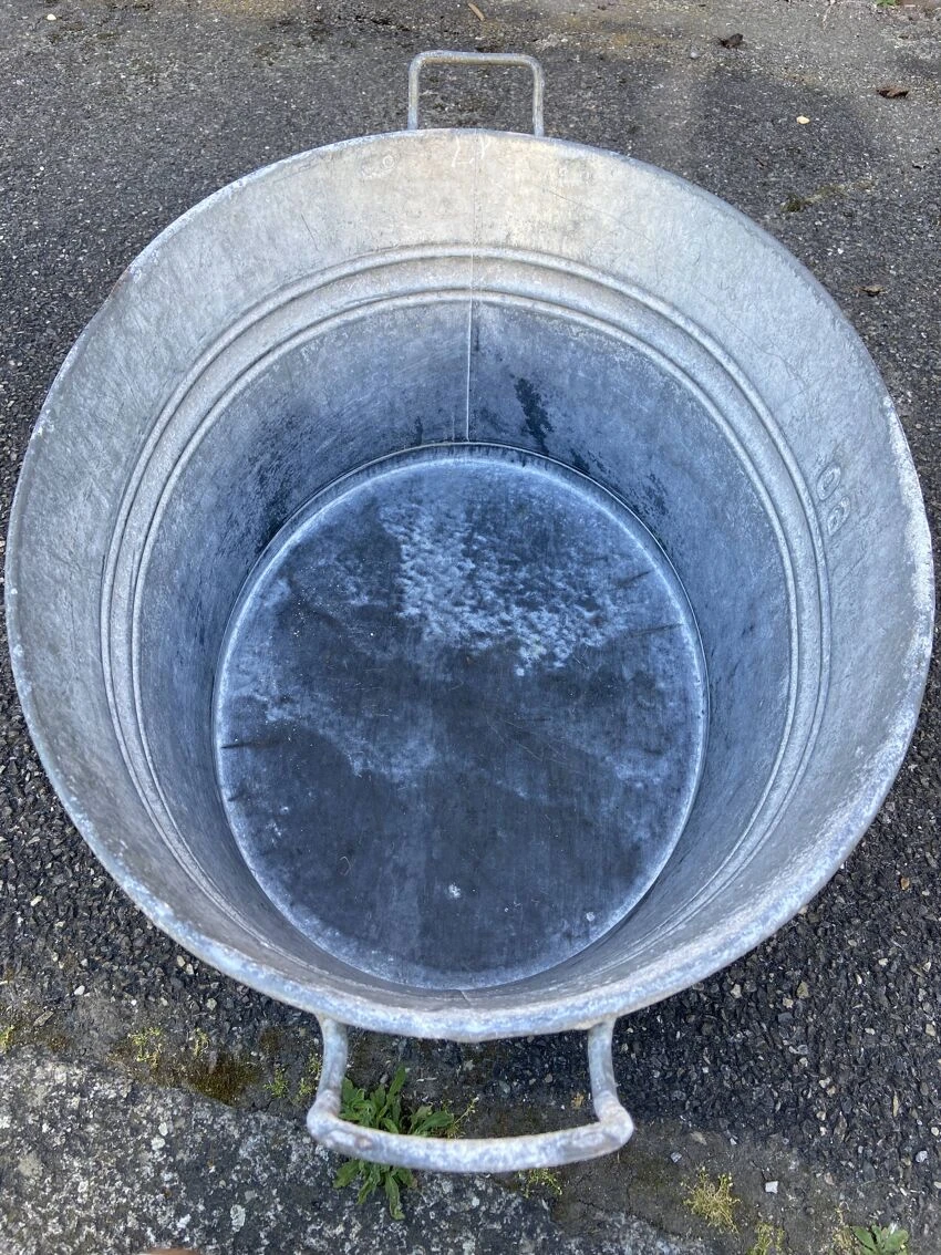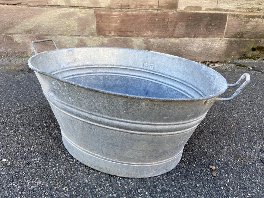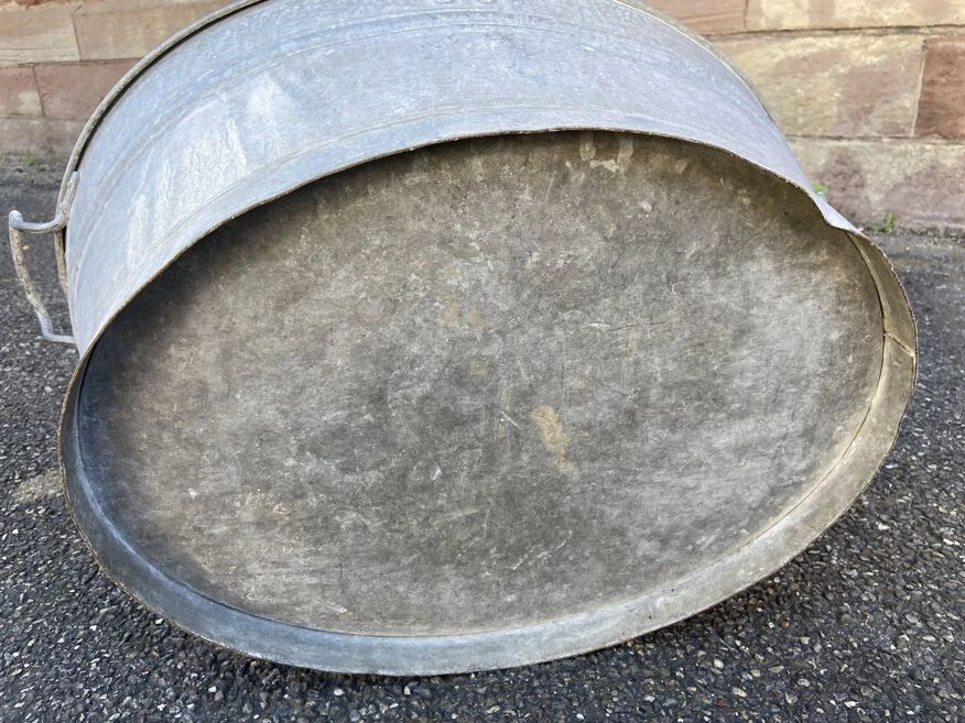 Bassine en zinc vintage 60 cm de long par 46 cm au plus large, 29 cm de haut, ( dimensions indiquées sans les poignées ! ) étanche, bosses par endroits.