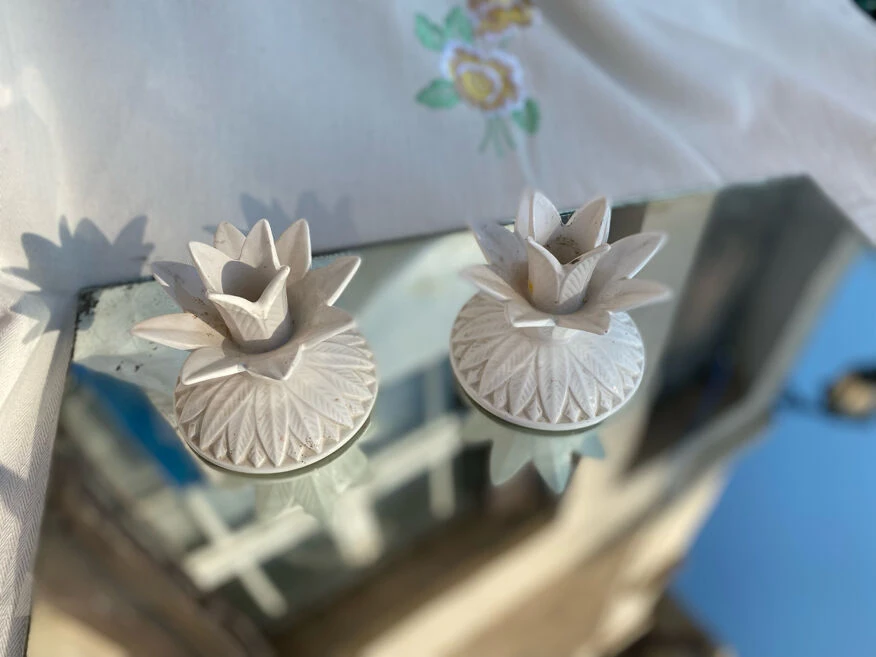 Deux bougeoirs ananas 10, 5 de hauteur et dessous diamètre 11 porcelaine blanche.