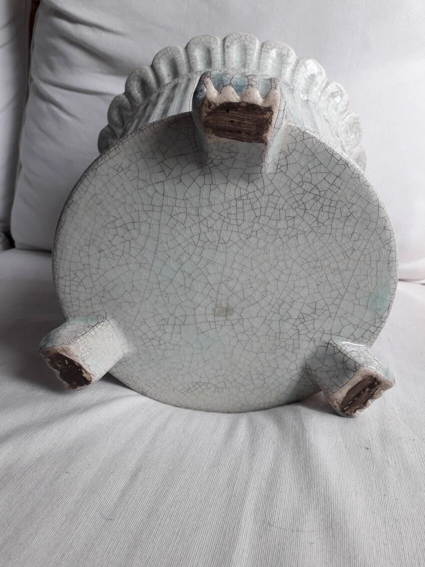 La céramique est de forme circulaire et travaillée avec 3 pieds en pattes de lion de couleur bleu ciel céladon.