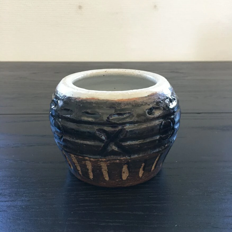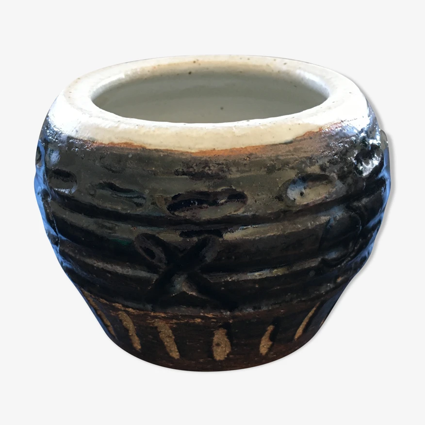Pot pièce unique signée de style brutaliste en grès décor de traits et de croix sur fond noir et brun foncé.