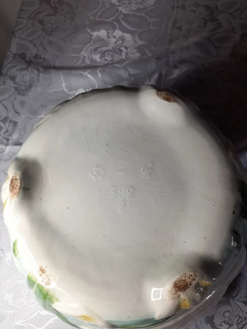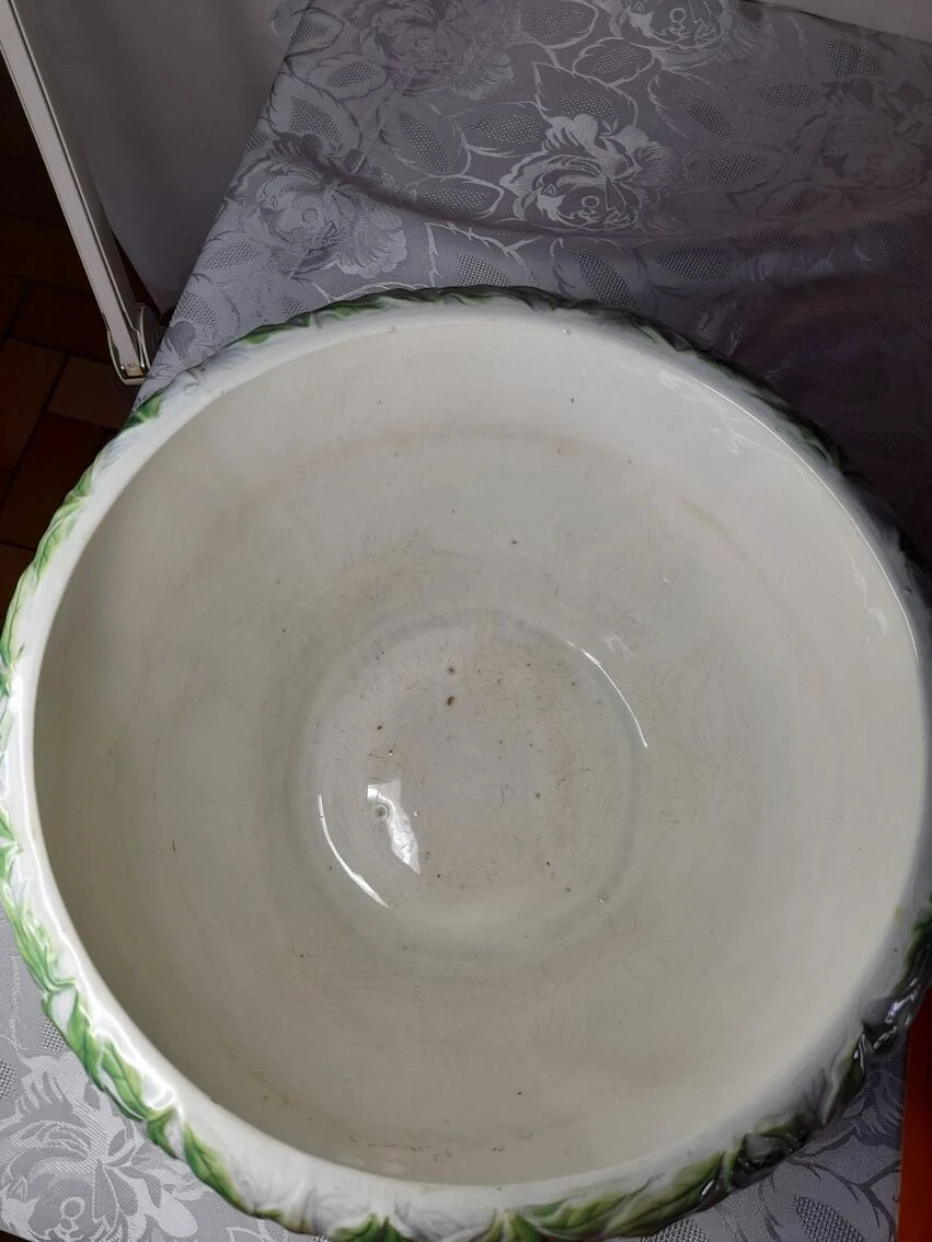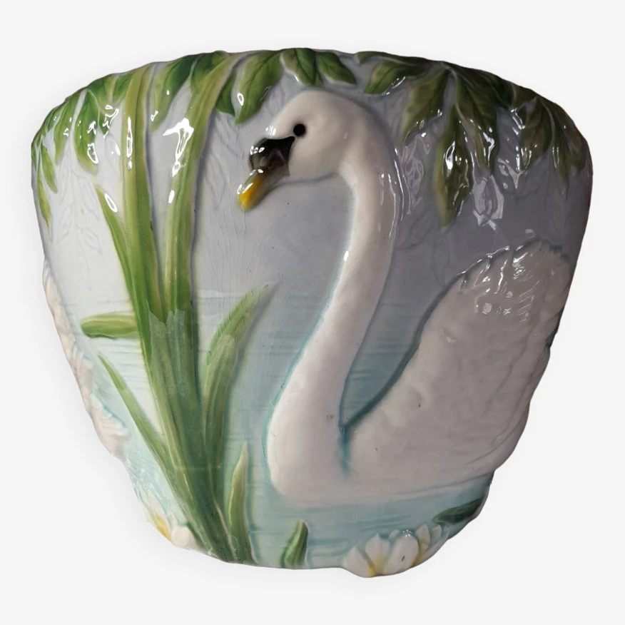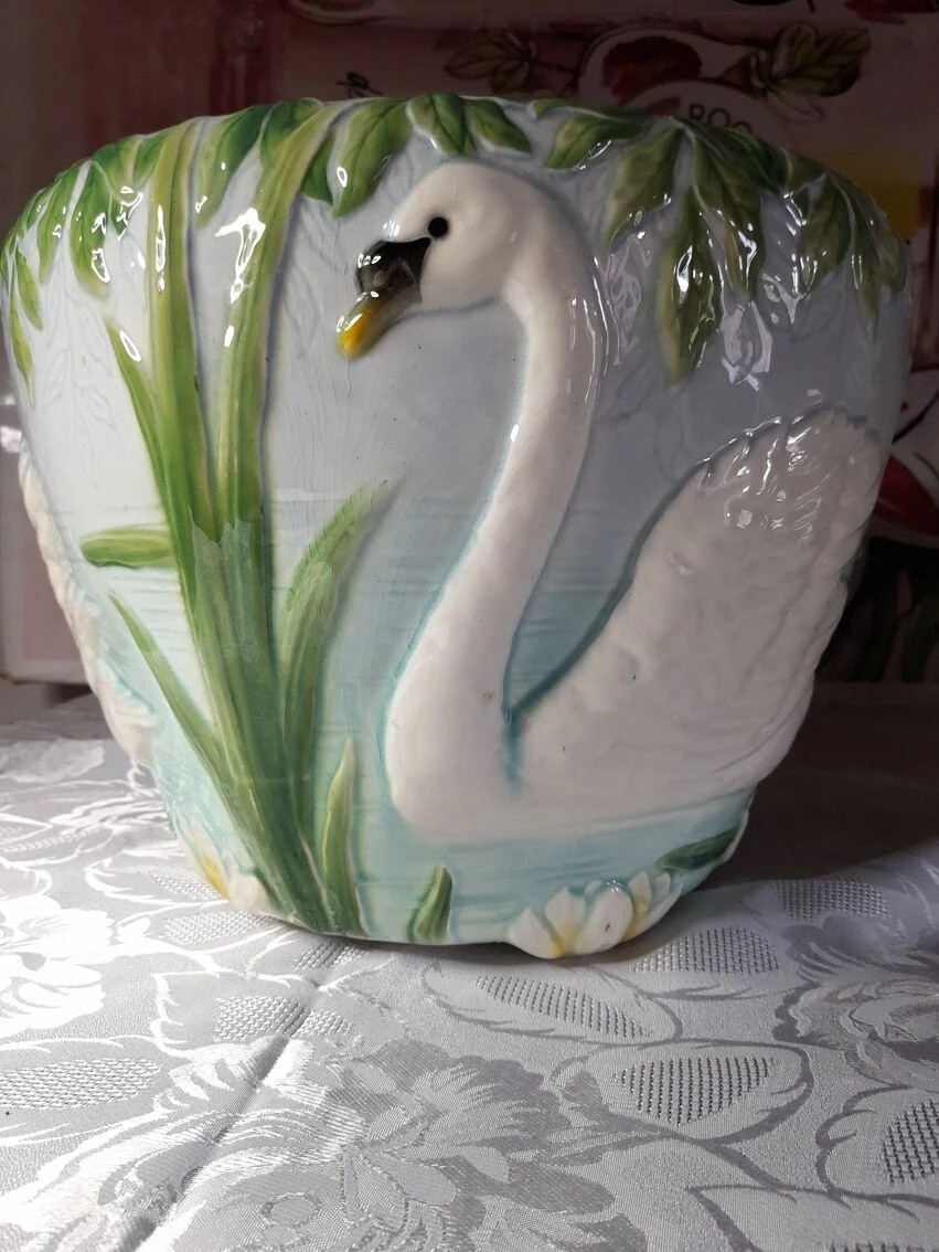 3 cygnes sur le pourtour du pot nageant sur l eau et nénuphar superbe cache pot xxl en parfait état, pas de fêle ni eclat. Cache pot xxl H 27 x l 33 profondeur 25 cm