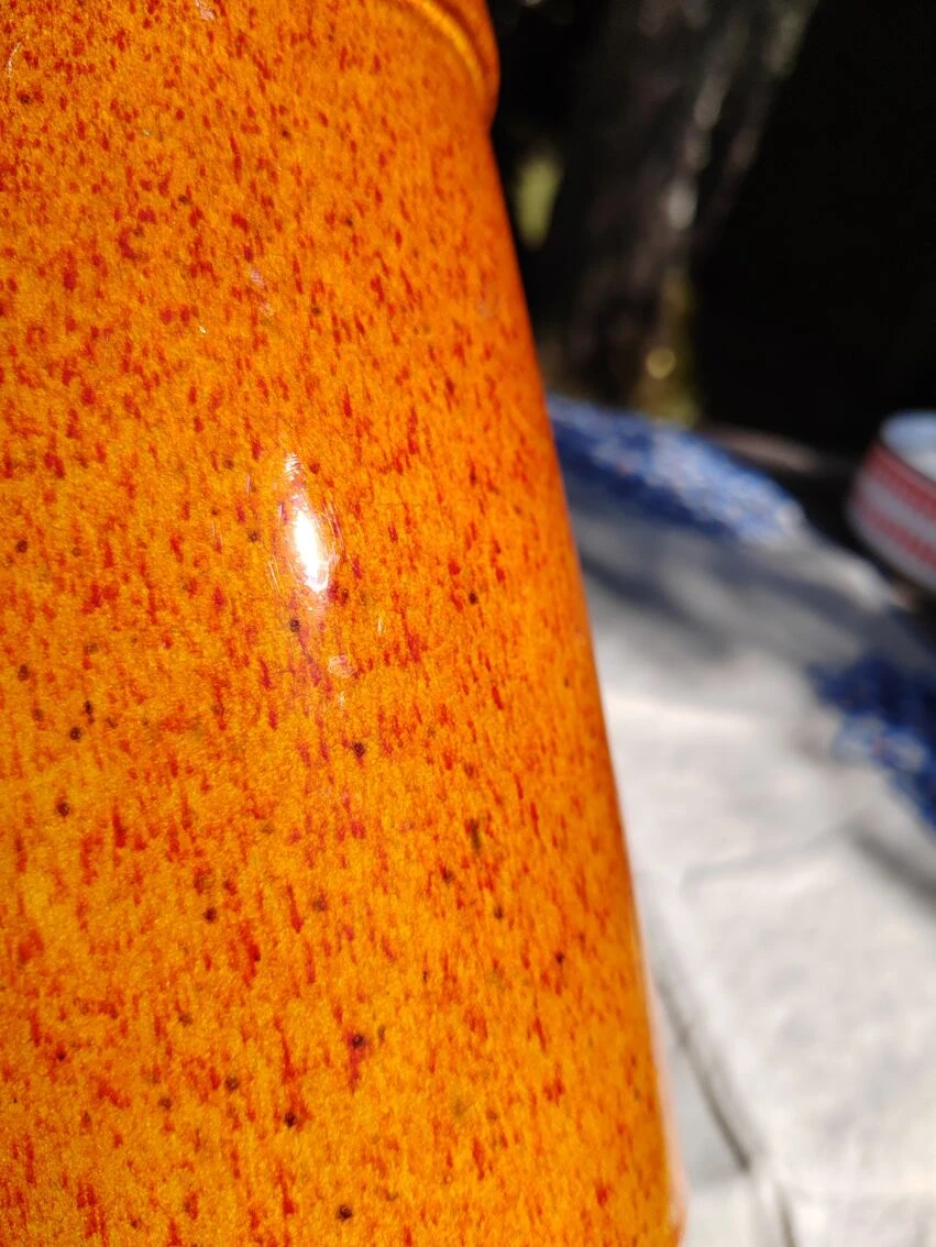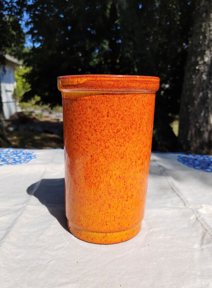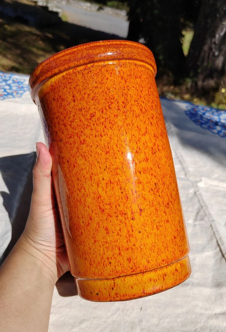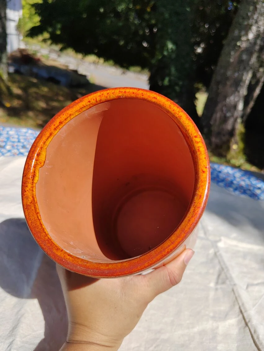 Cache pot, en terre cuite émaillage dans les tons orangé moucheté.