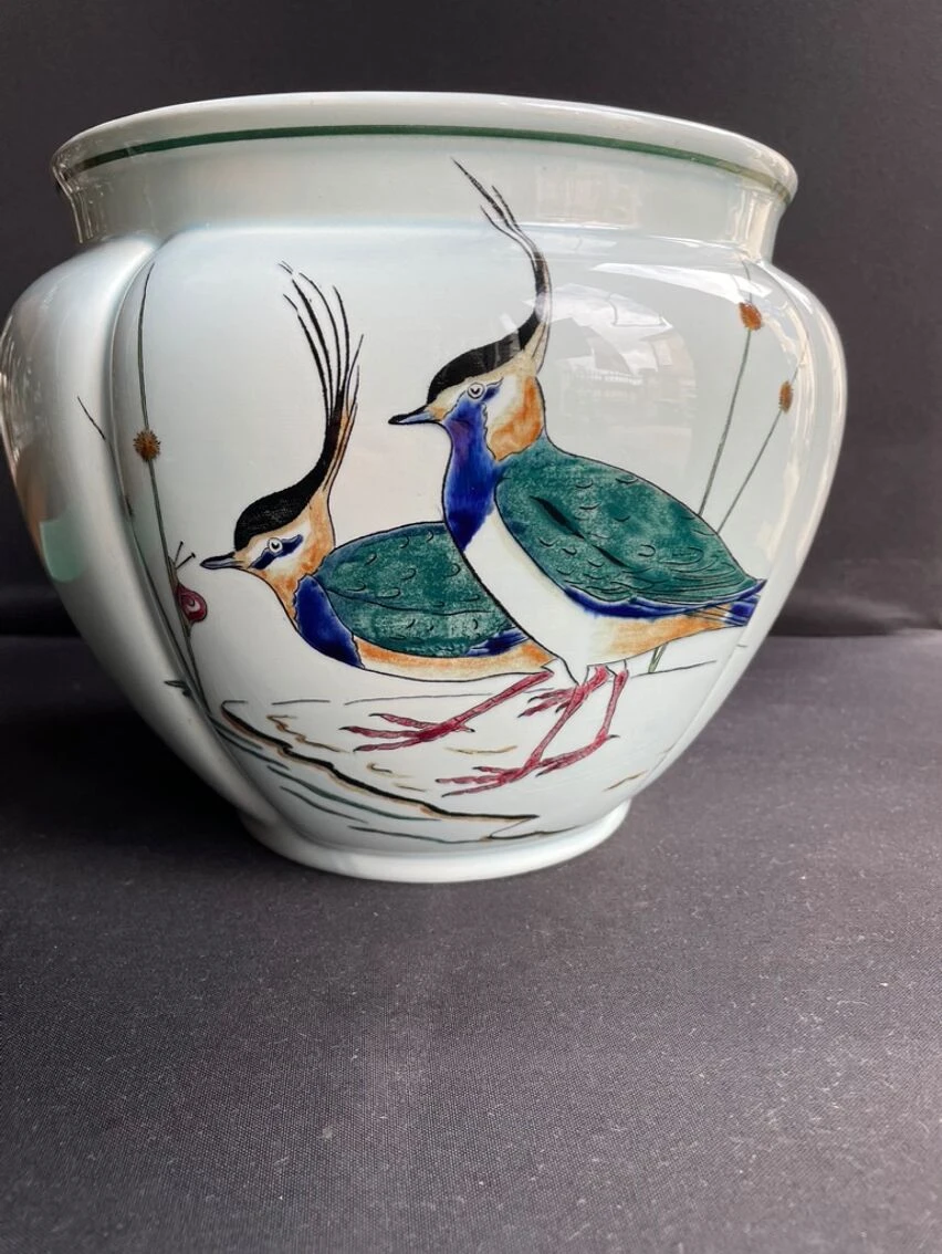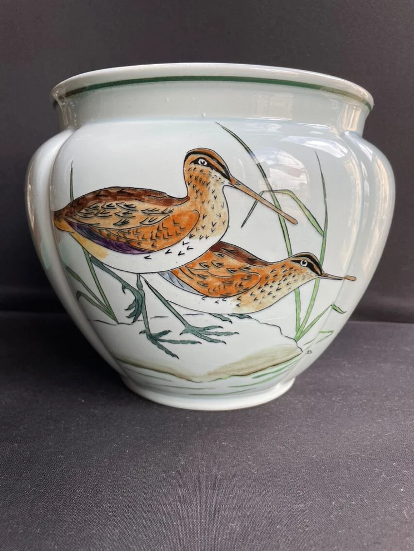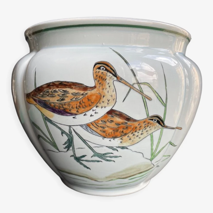 Décor signé bb d’oiseaux sur la panse de vanneaux huppés avec un escargot sur un jonc et de bécassines des marais.