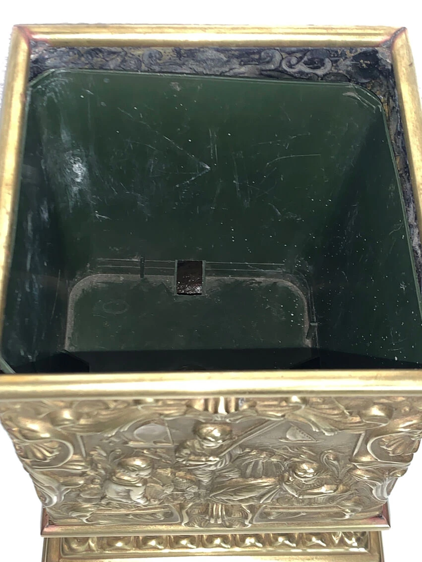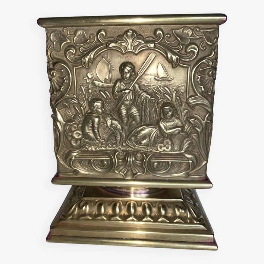 Cache pot en laiton repoussé 19e, scène de famille pêcheur sur les quatre faces, signé boudon, protection intérieur ajoutée en plastique et métal non percé par le temps.