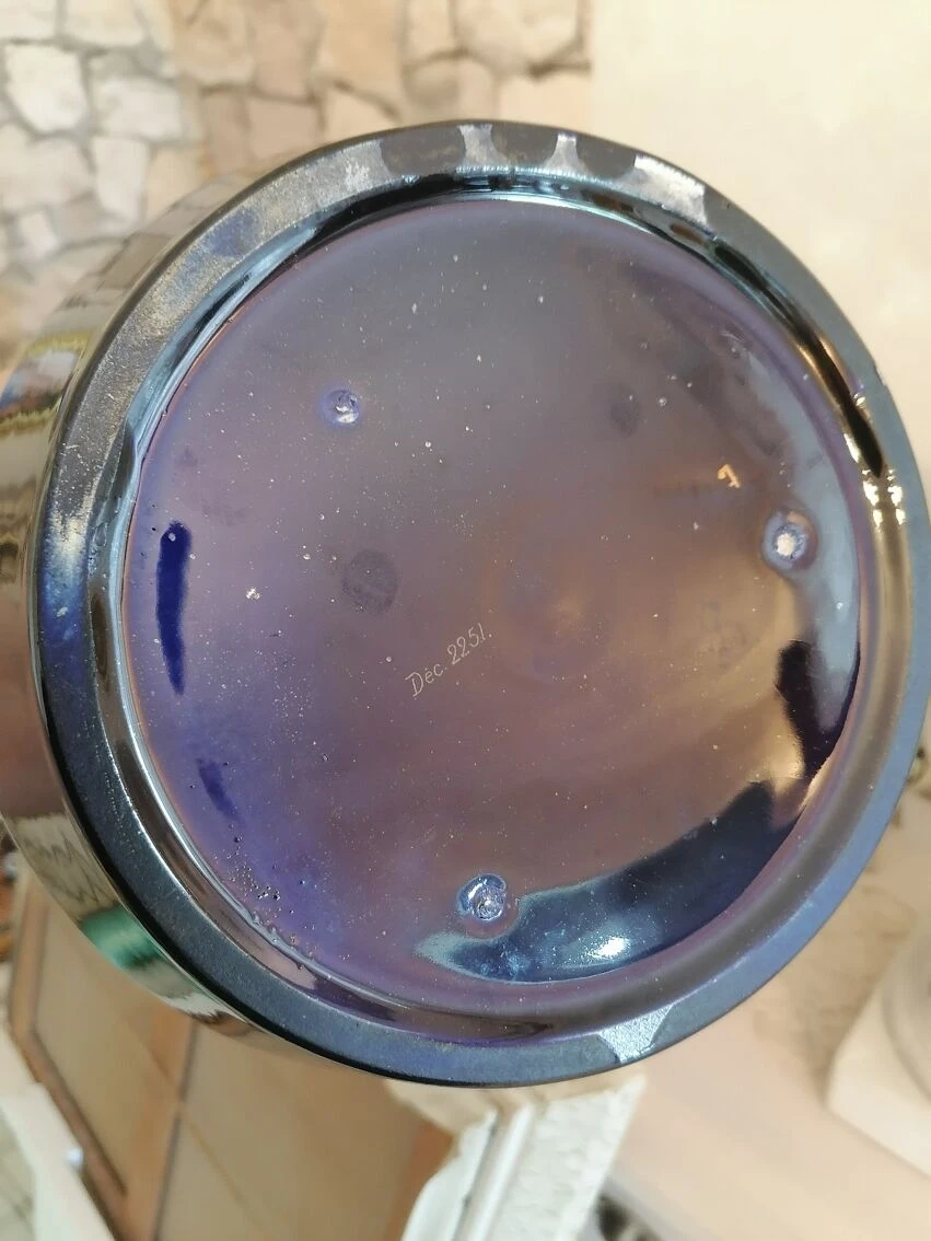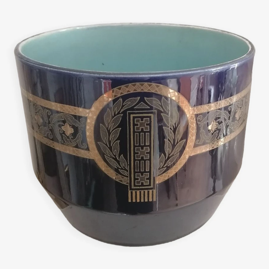 Superbe cache pot bleu et or en grès majolique litochromie de la faïencerie de sarreguemines, époque fin 19eme.