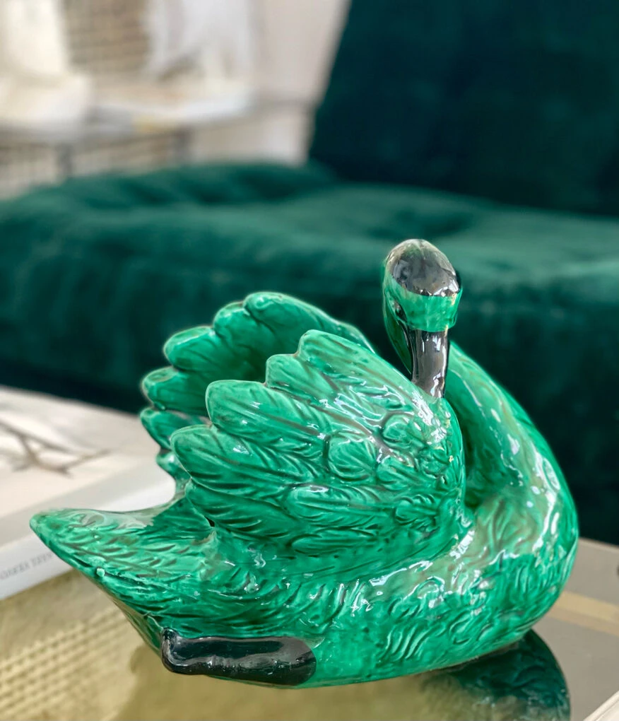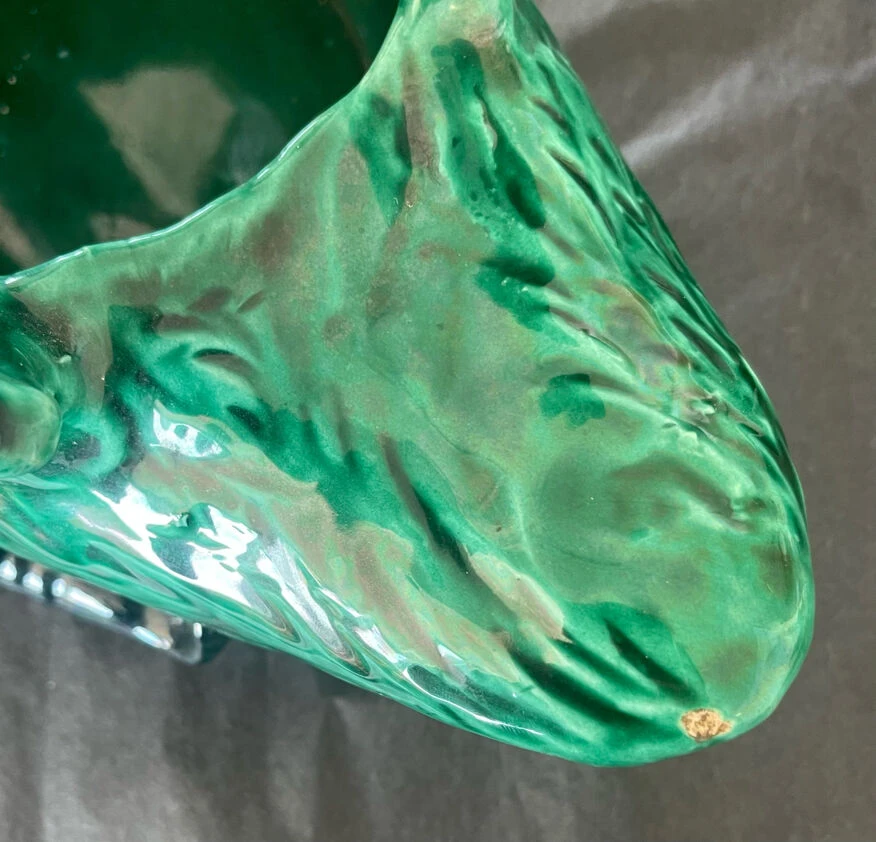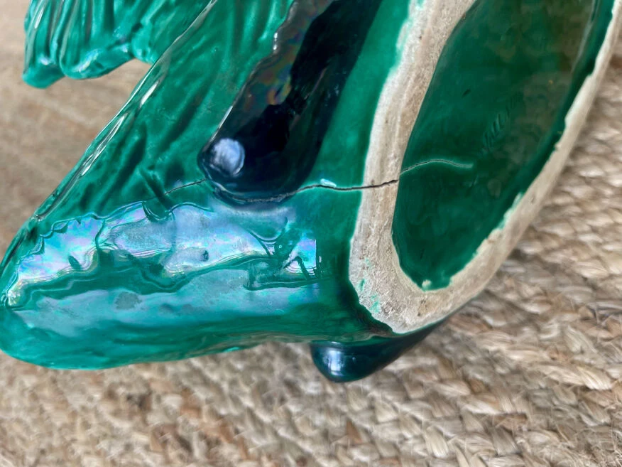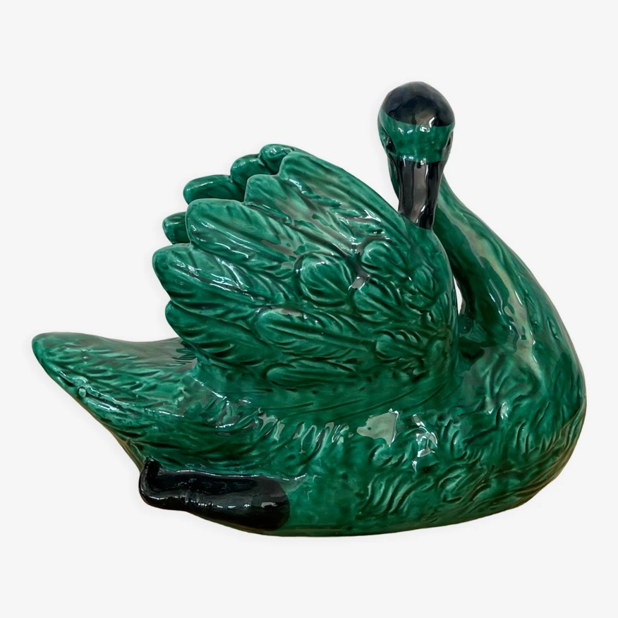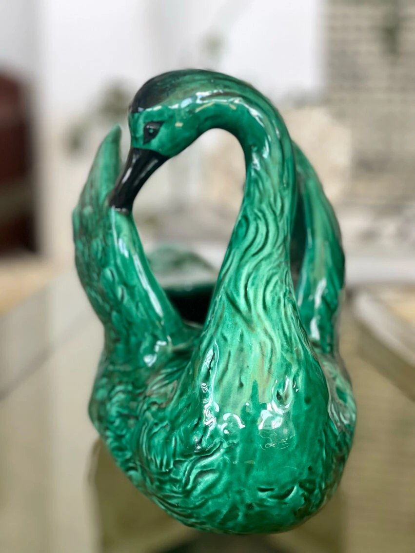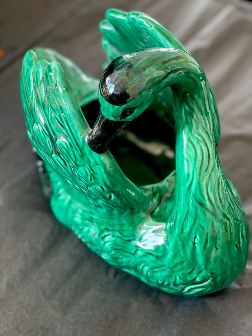 Je vous propose ce sublime cache pot vallauris vintage 1950, cygne vert avec quelques touches de noir, faïence barbotine en bel état général, une fêle en son fond qui n’altère en rien son design, une pièce ancienne de qualité et reconnue.