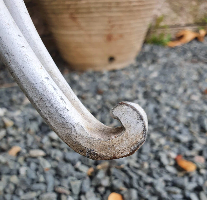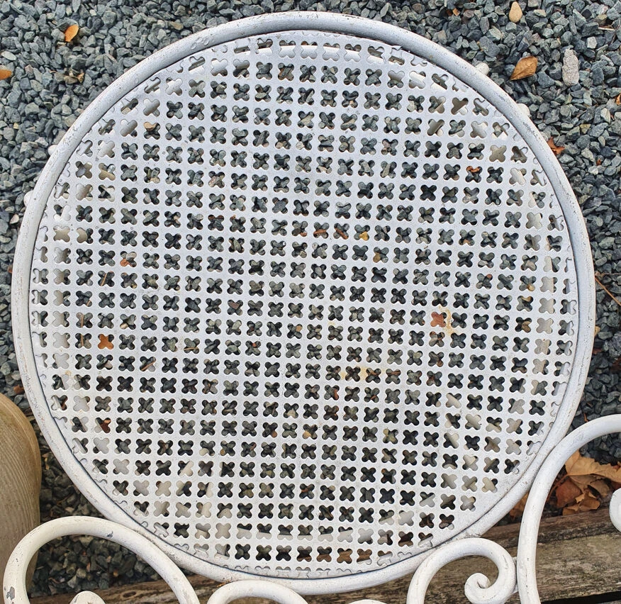 Chaise basse (assise 34 cm) en métal blanc, peinture d’origine, bon état.