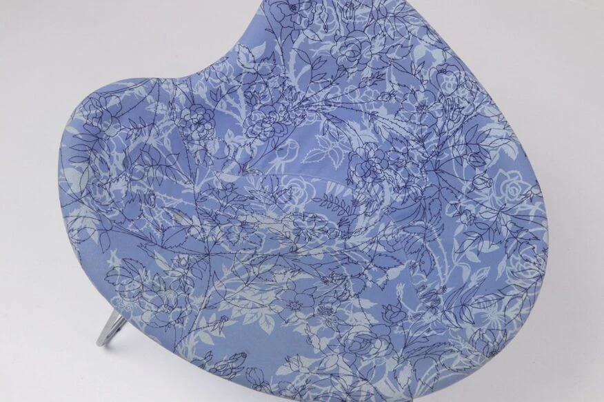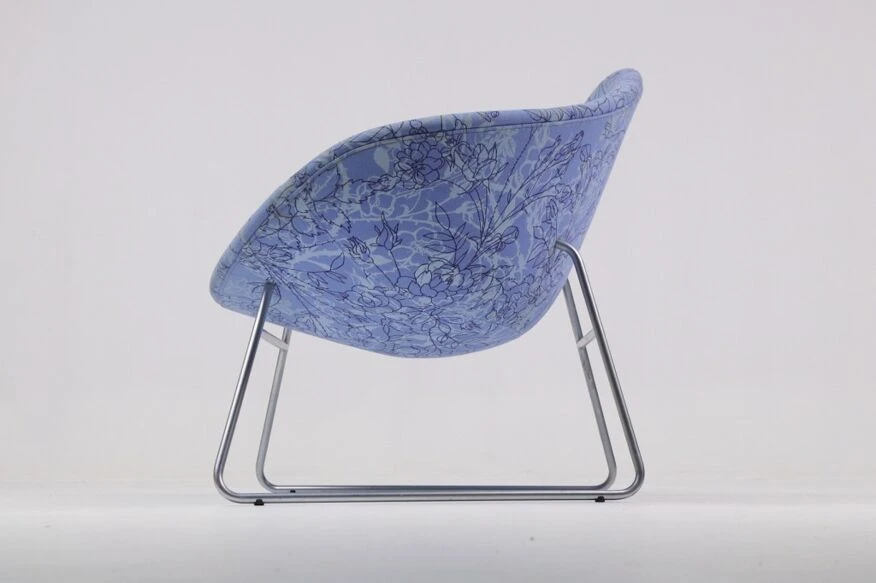 Cette chaise est recouverte d’un tissu bleu à motif floral et possède une structure en chrome mat.