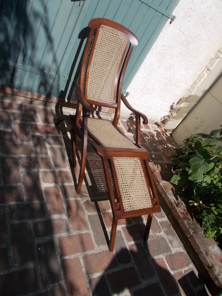 Très jolie et ancienne chaise longue de pont de paquebot, des années 20, en acajou, cannage en corde.