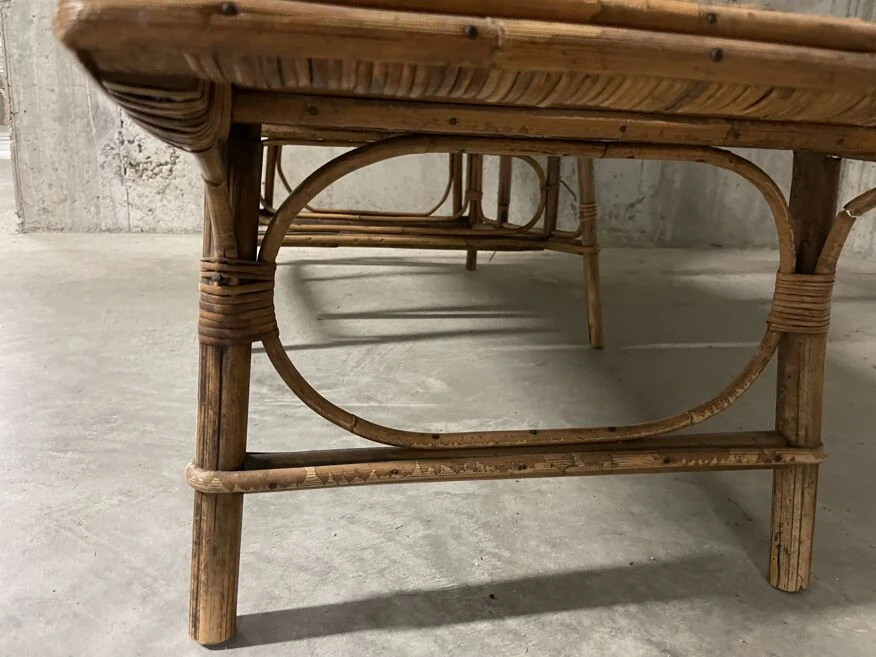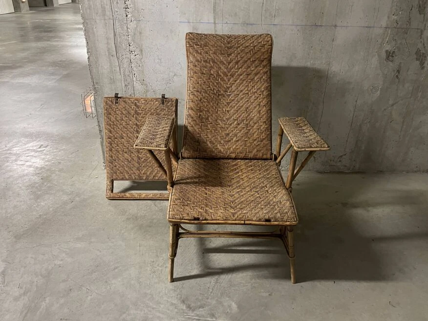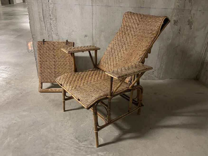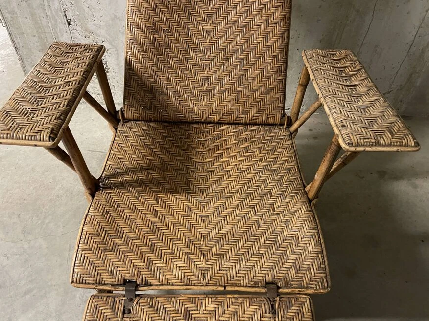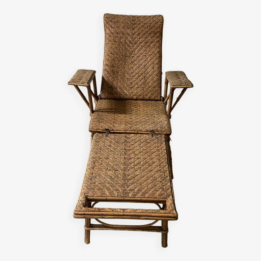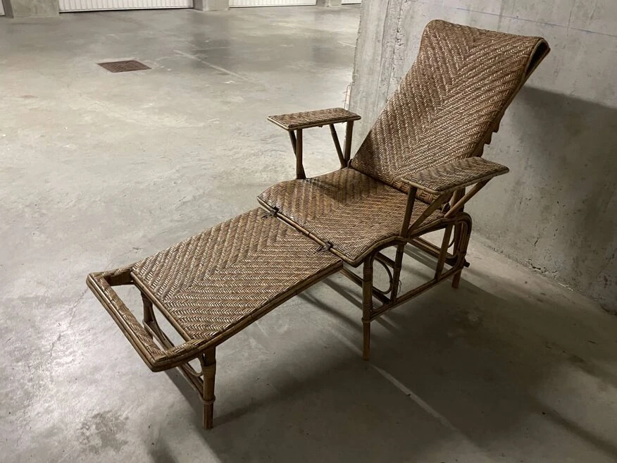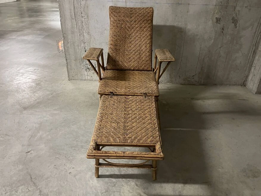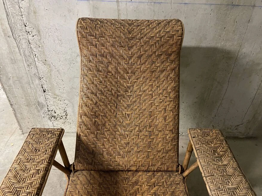 Superbe chaise longue transat en rotin et bois des années 40, dossier rabattable, repose-pieds amovible, traces d’usage (voir photos), assise en très bon état, chaise très solide et stable, 4 niveaux de réglage, hauteur totale dossier 100cm, hauteur assise 42cm, encombrement hors tout l.80xp.80cm, assise 50x50cm, longueur totale de l’assise avec le repose-pieds 110cm.