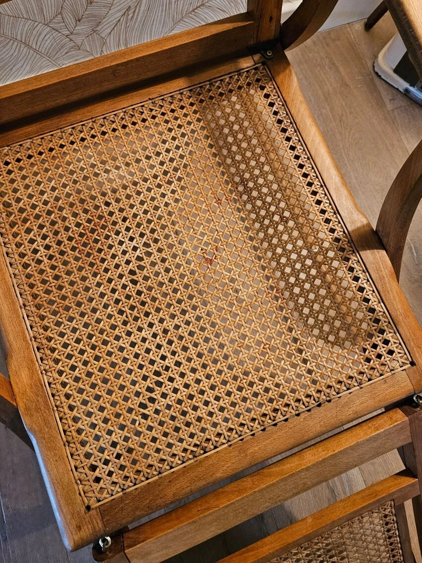 Cannage en très bon état: pas d’accroc, ni de manque; quelques traces de vernis sur l’assise à peine perceptibles.