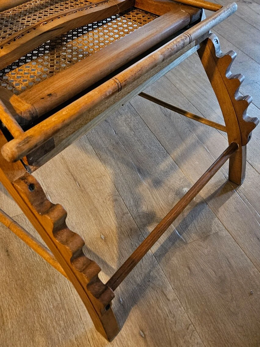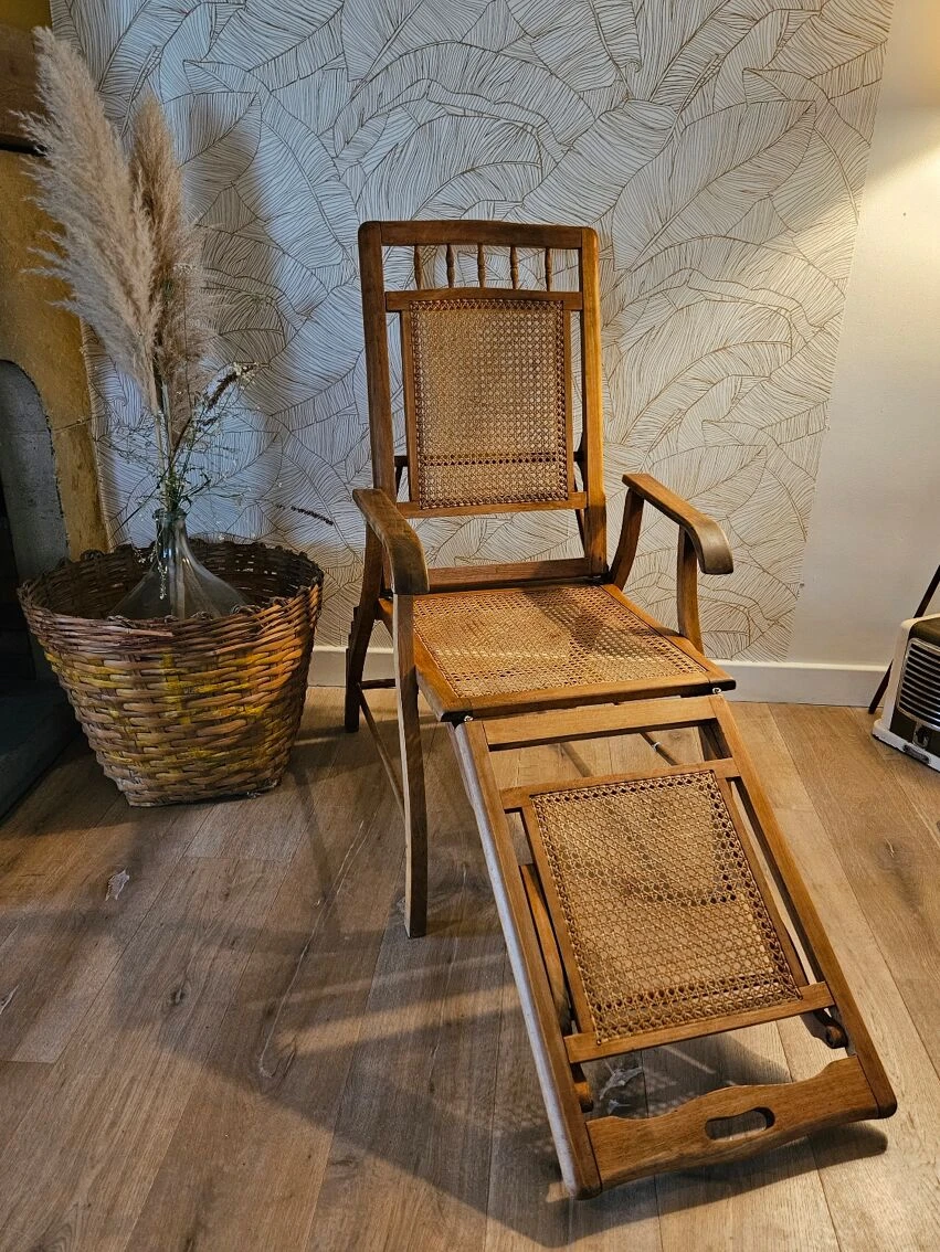 Chaise longue pont de bateau en bois (chêne) et cannage en osier des années 30.