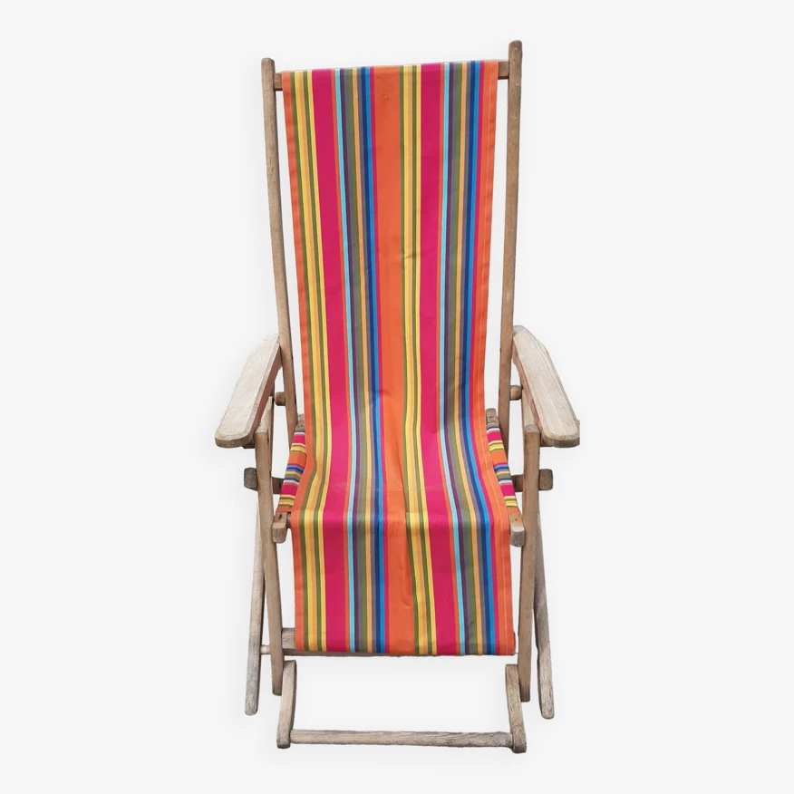 Chilienne en hêtre des années 1940 en parfait état le tissus a été changé, de chaque coté il y a une vis de serrage en bronze qui permet de bloquer ou débloquer le dépliage du fauteuil.
