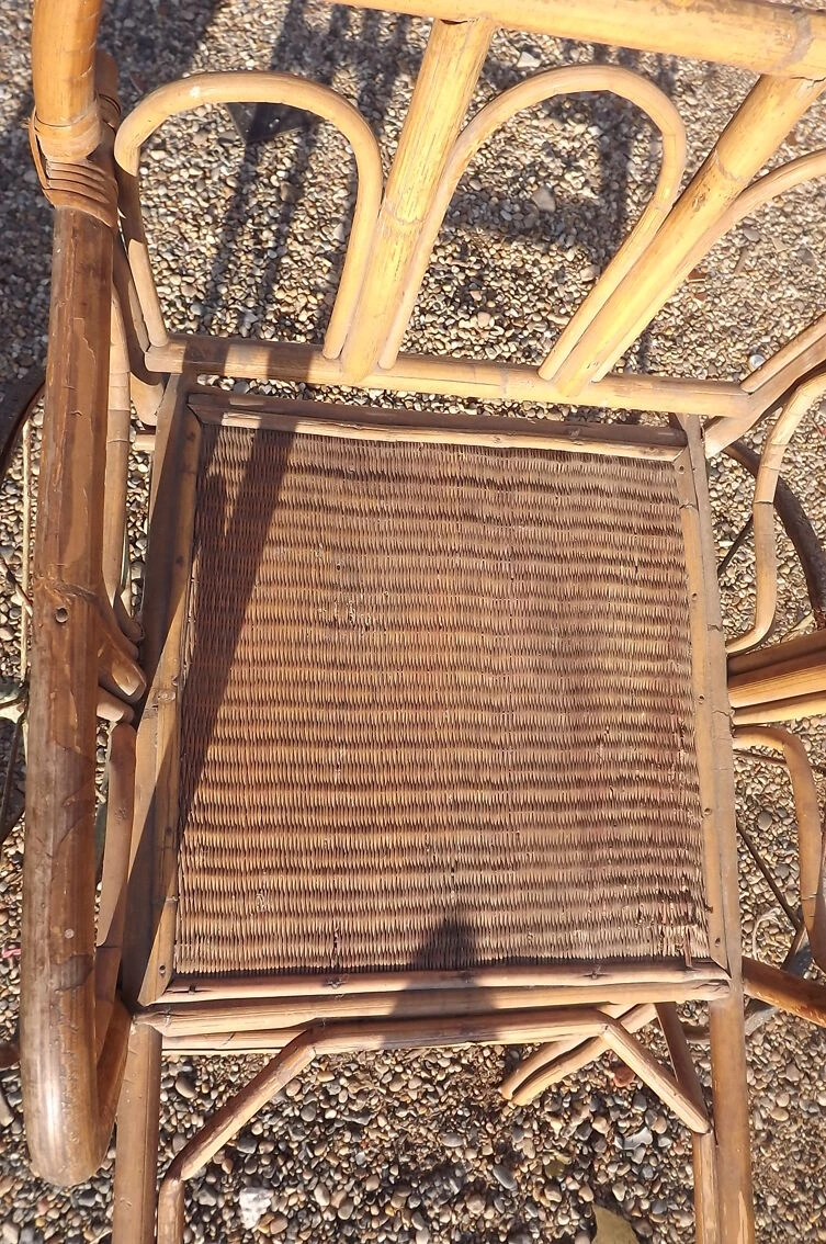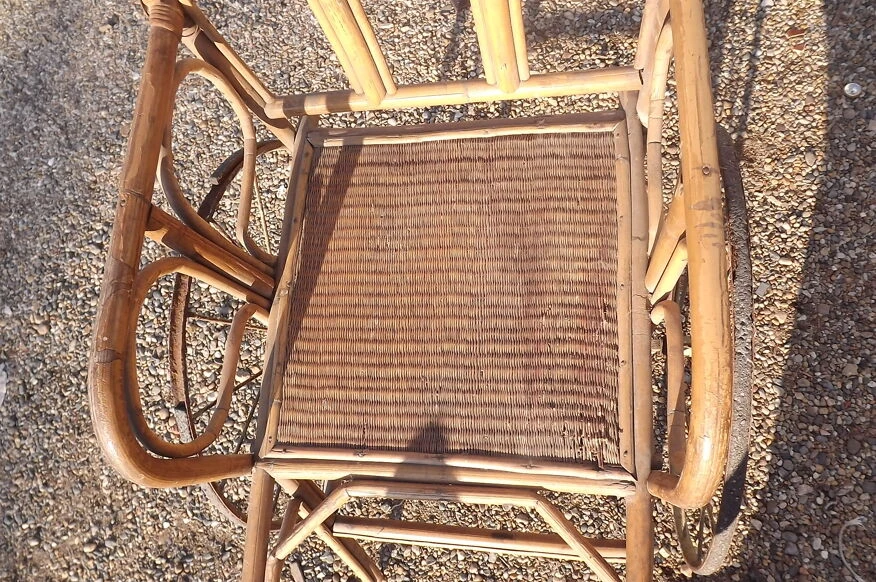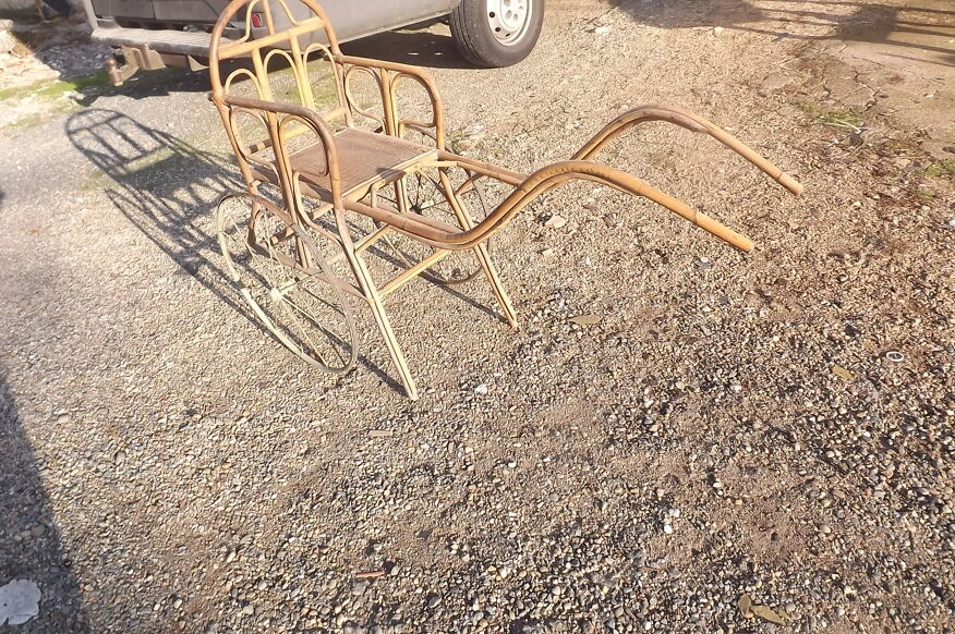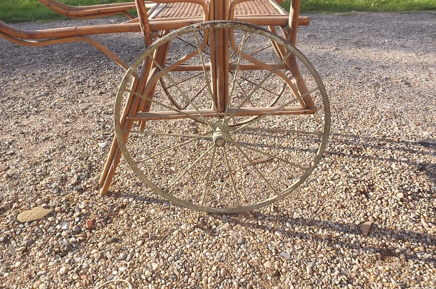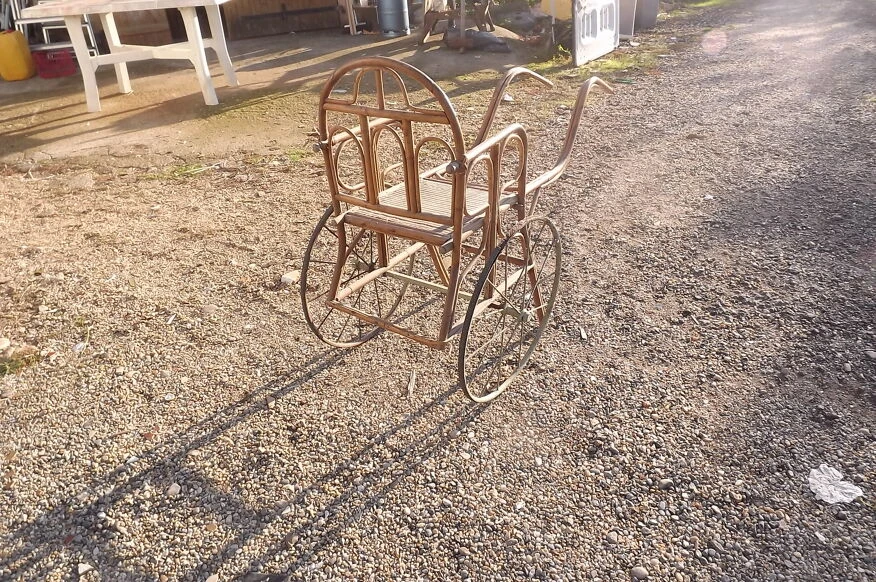 Charette enfant 1900 bambou et osier, roues fer et gomme, haut: 86 cm, long et larg: 132 cm sur 56 cm.