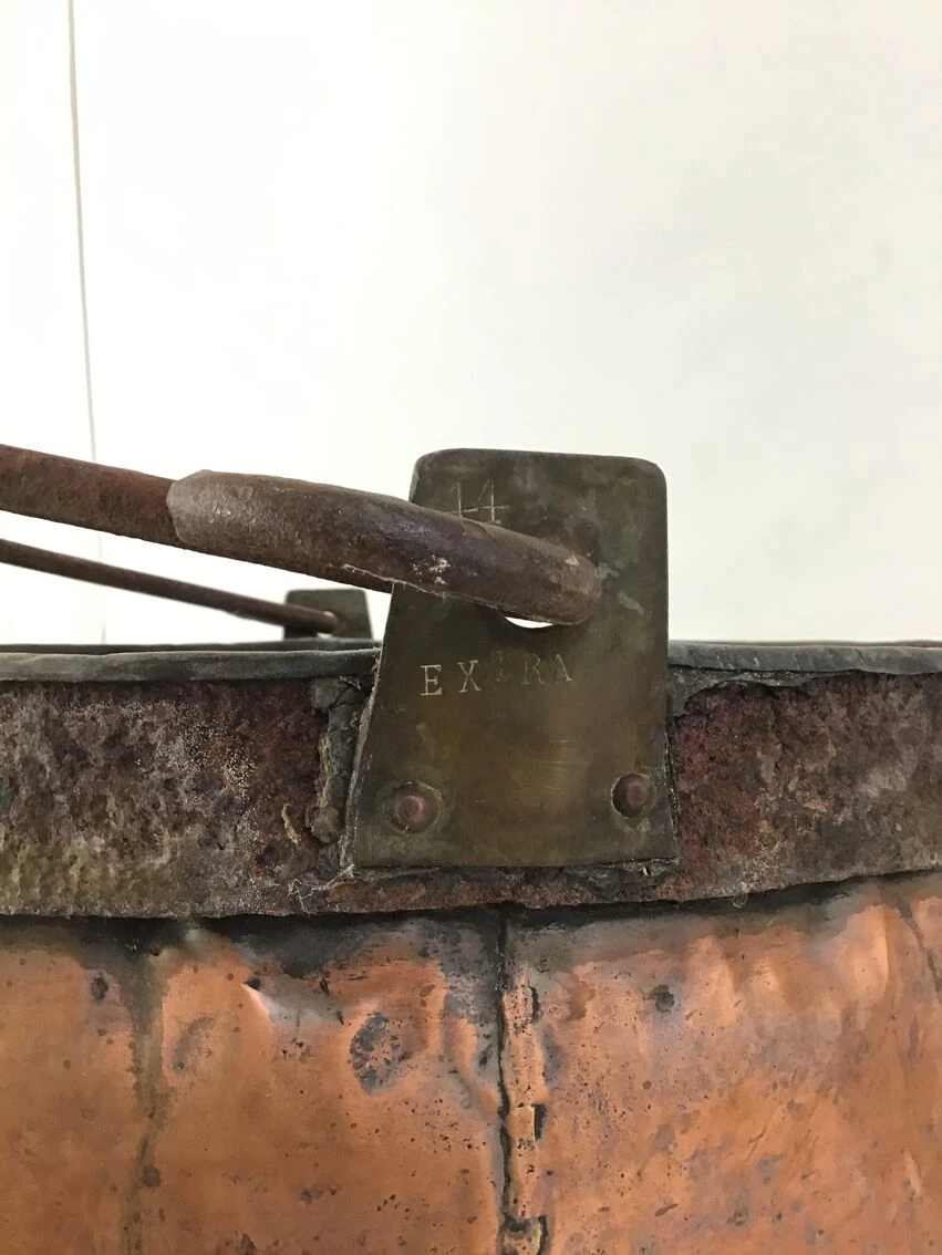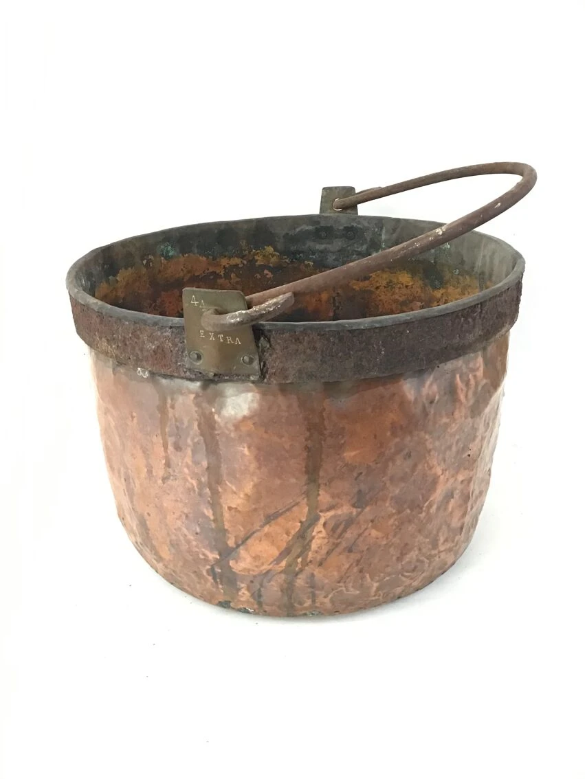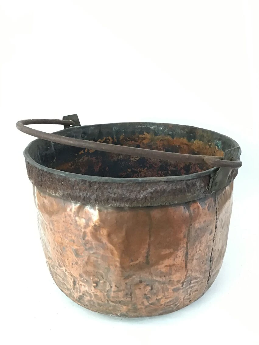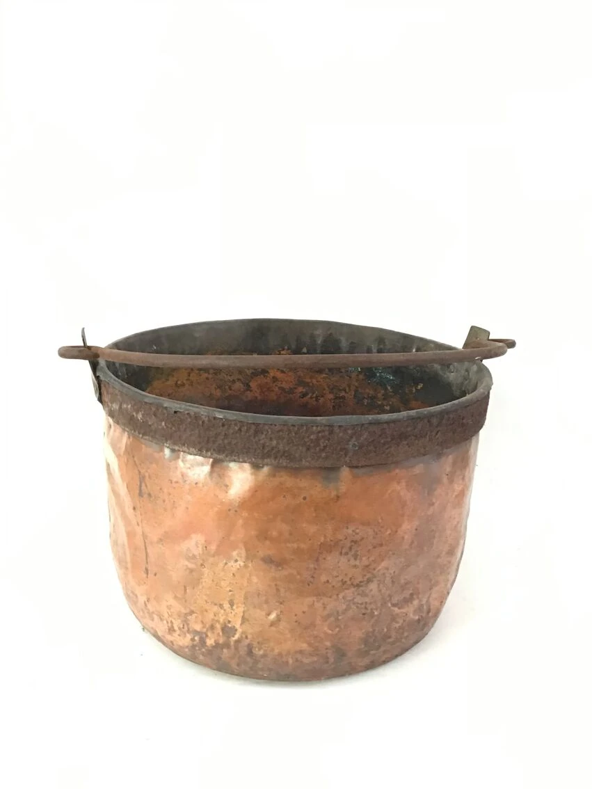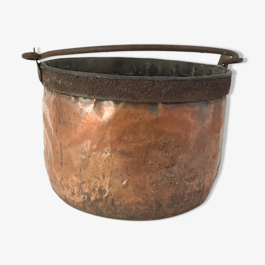 Grand chaudron en cuivre et poignée en fer.