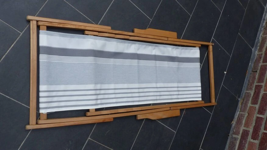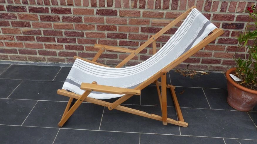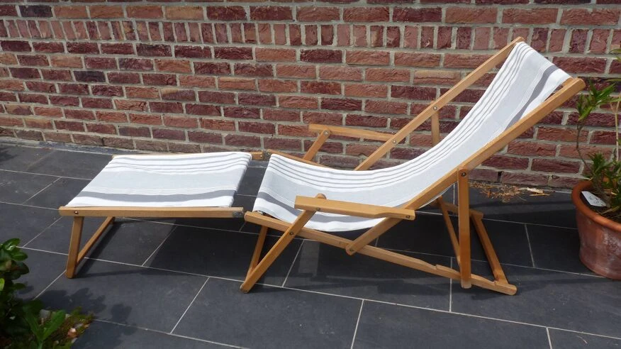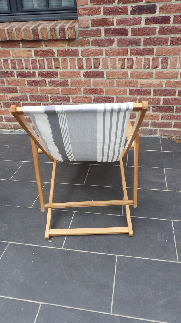 Ancienne chilienne avec repose pied, tissu neuf, 3 positions h 60cm, l 170, p 60cm.