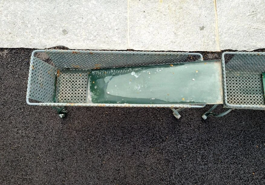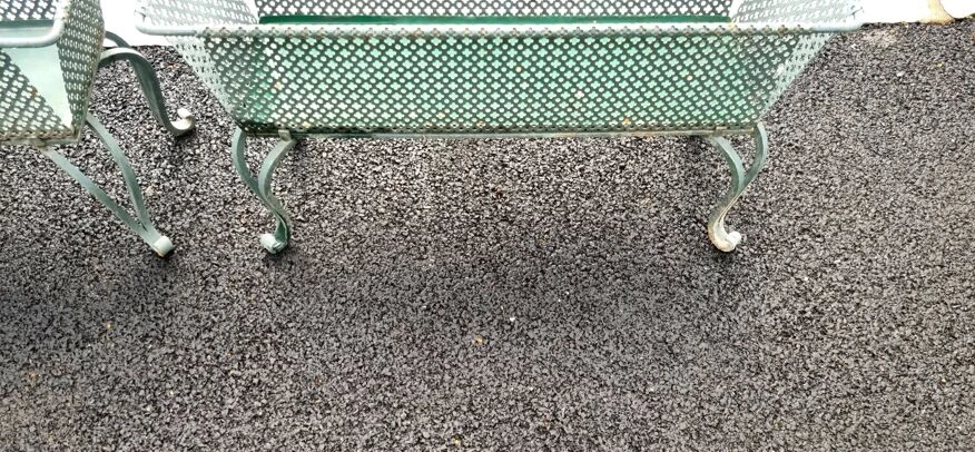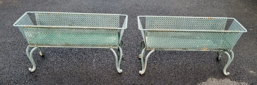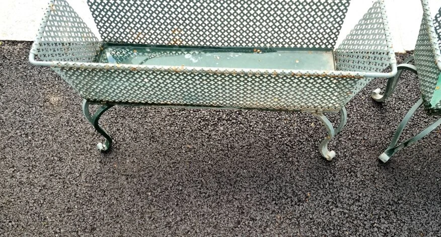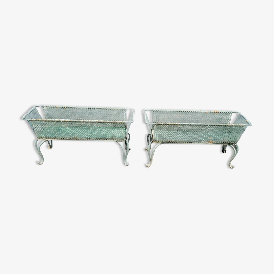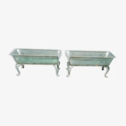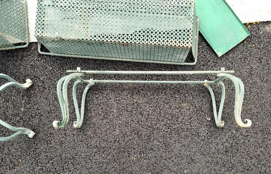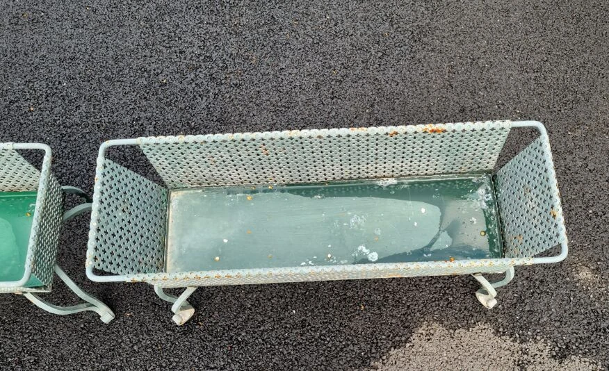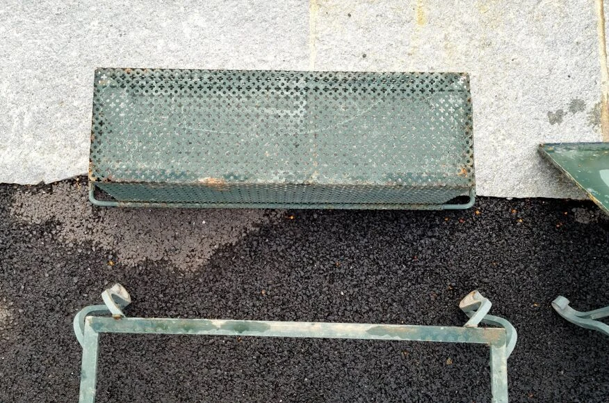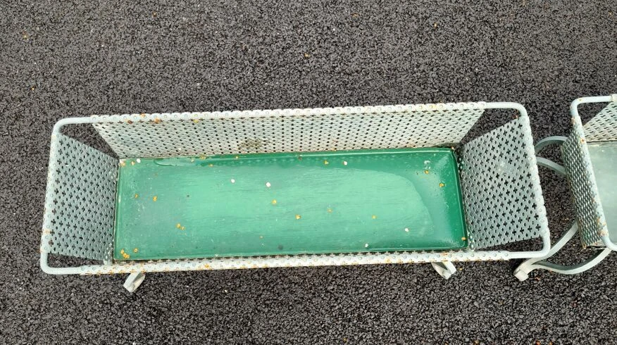 Métal vert perforé, plateaux du fonds et piètements amovibles.