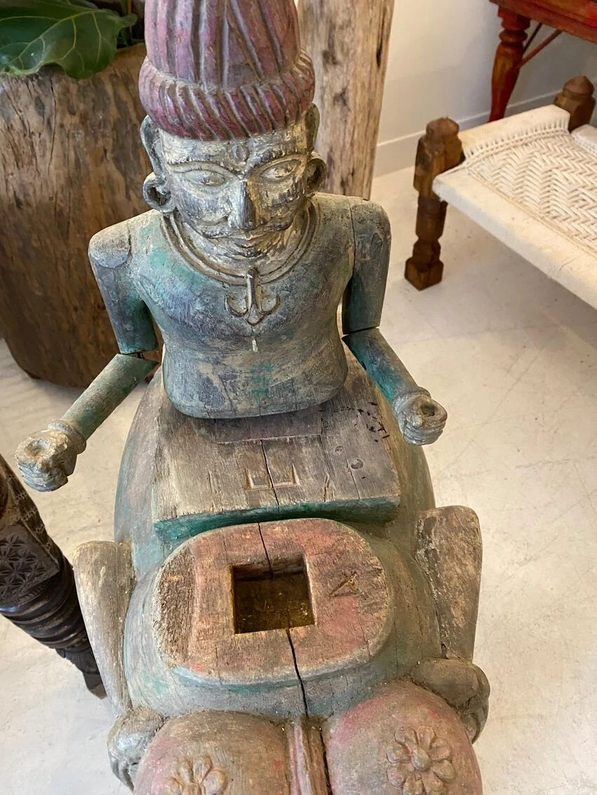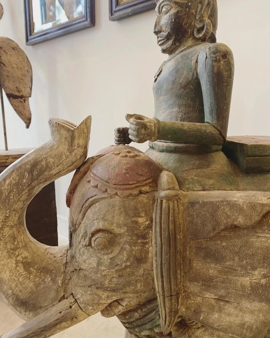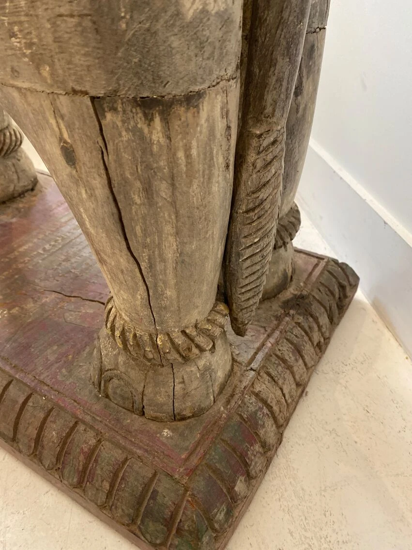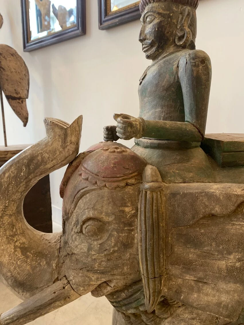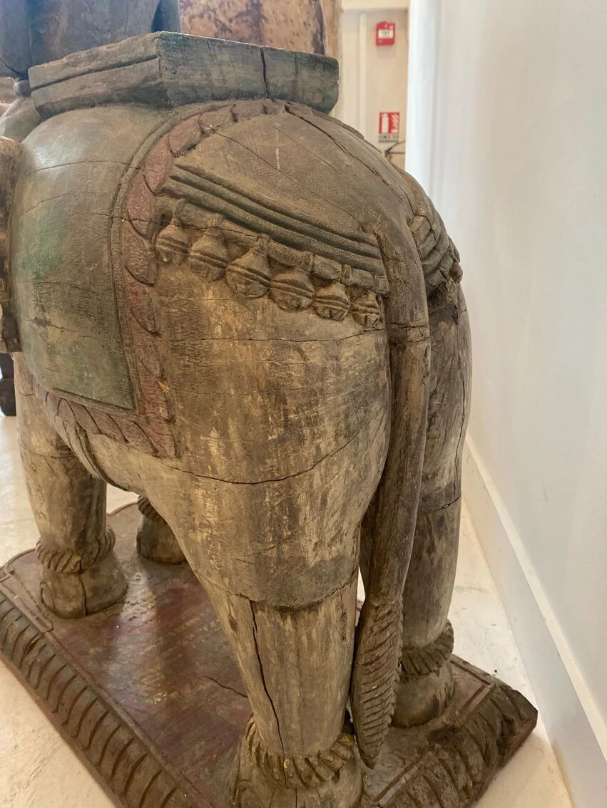 Sculpture indienne en bois polychrome représentant un éléphant et son carnac.