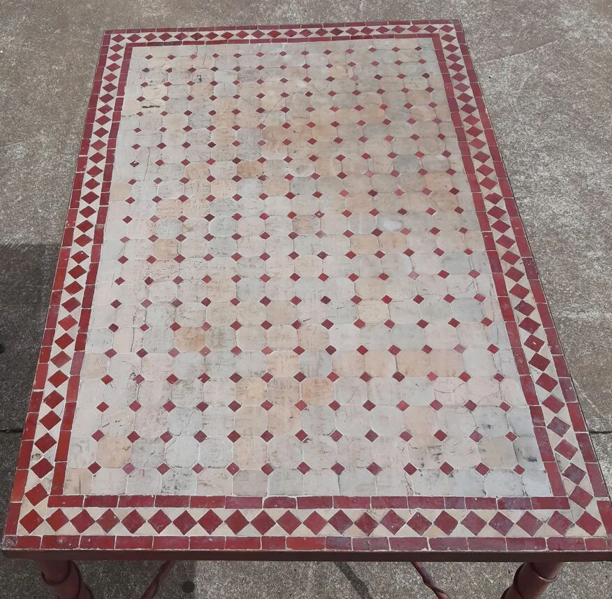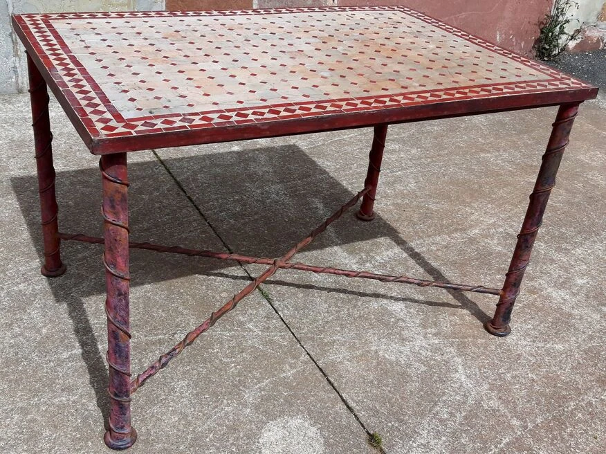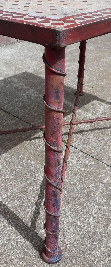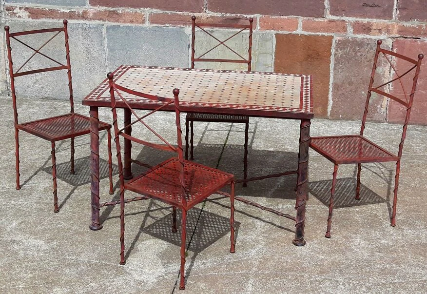 Ensemble de jardin constitué d’ une table plateau mosaique et de 4 chaises métal forgé.