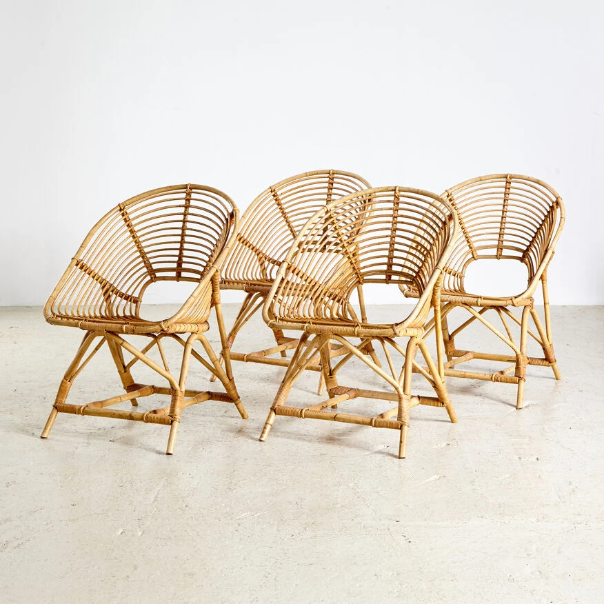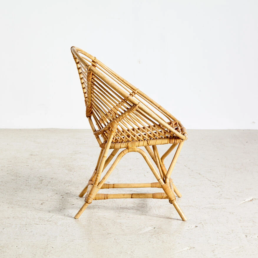 Fuateuil de jardin en rotin en forme de coquille sur cadre en bambou incurvé en état de nic.