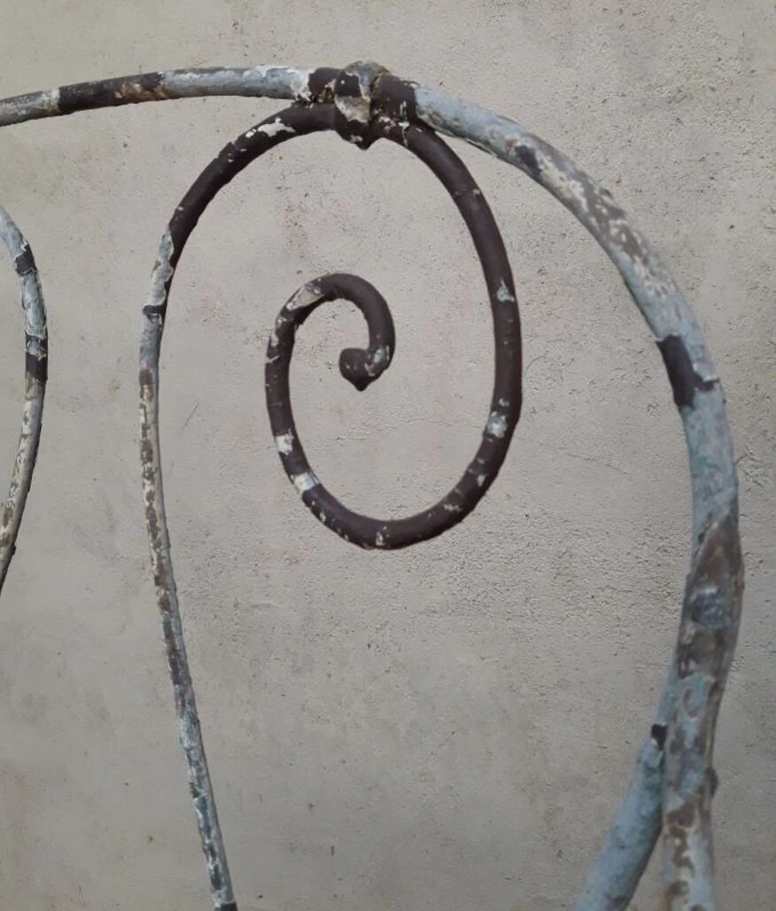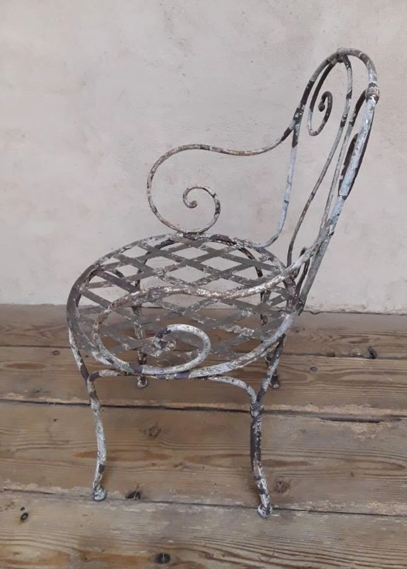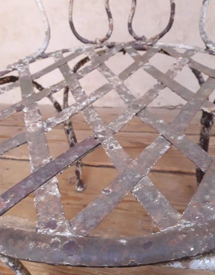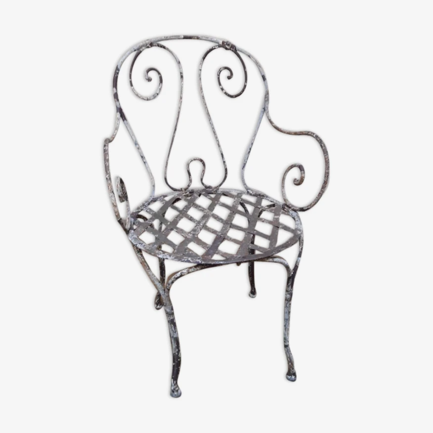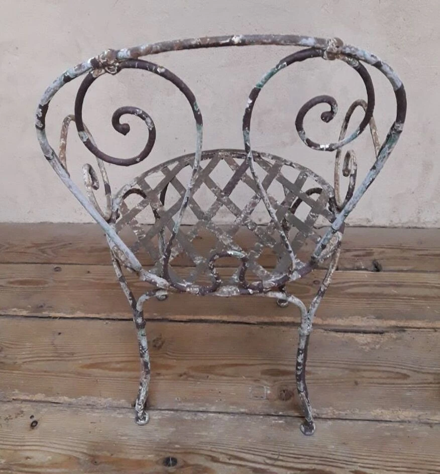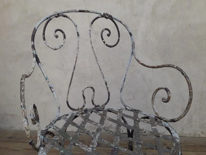 Rare fauteuil de jardin en fer forgé de belles proportions, solide et accueillant avec ses volutes, son assise de bandes de métal tressé, ses pieds mouvementés.