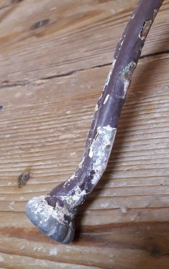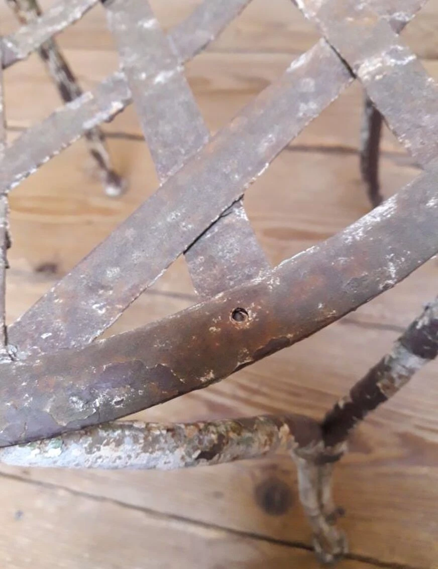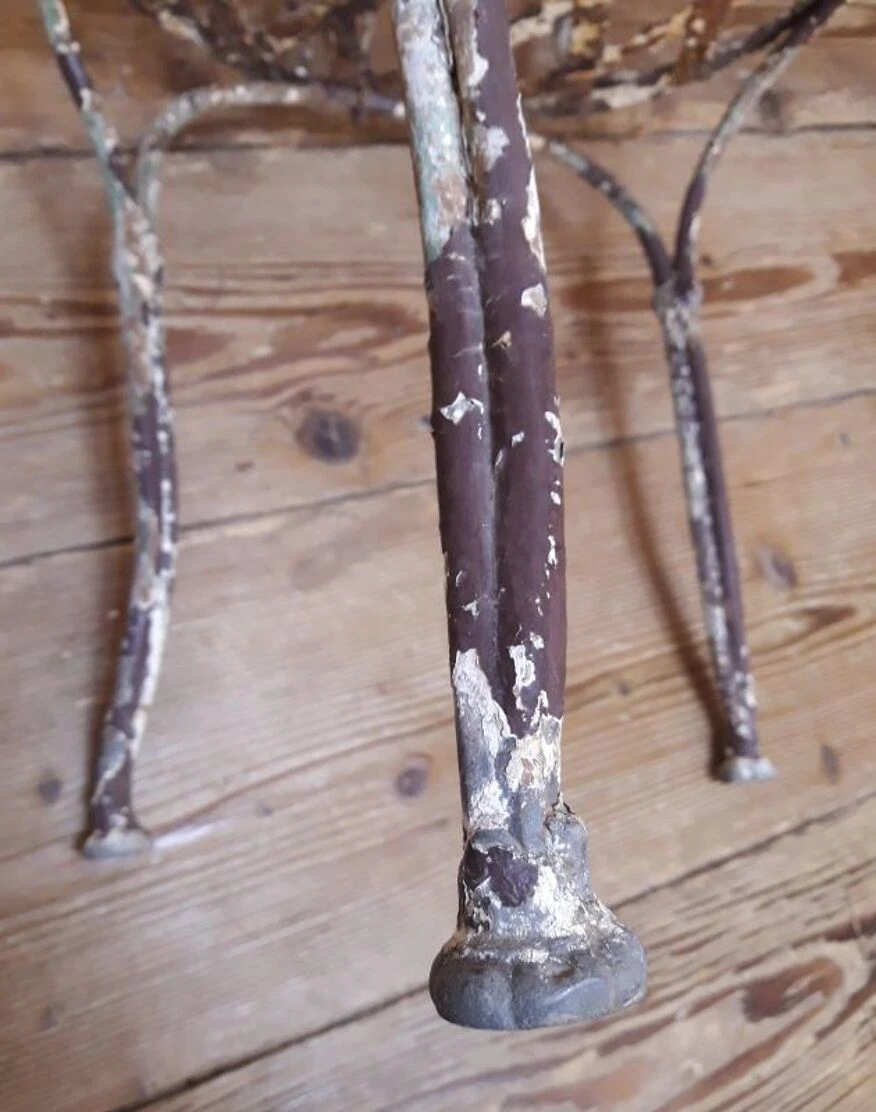 Authentique, juste légèrement brossé pour le dépoussiérer et faire tomber la peinture trop écaillée, il porte les marques du temps (il manque un rivet au niveau de l’assise, visible sur nos photos).