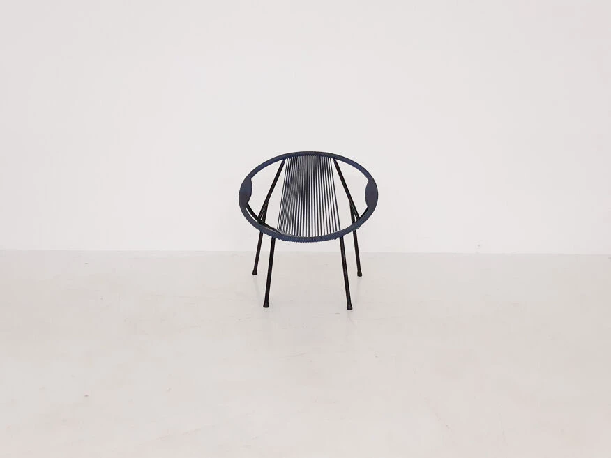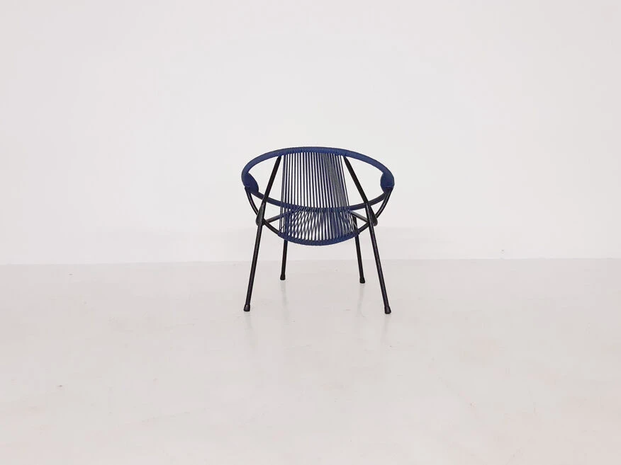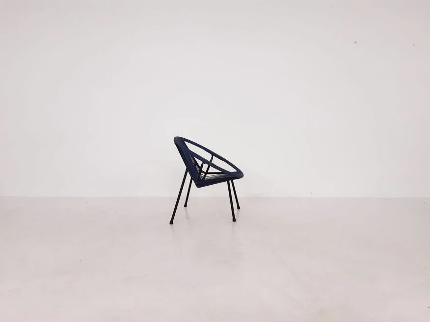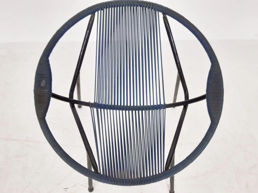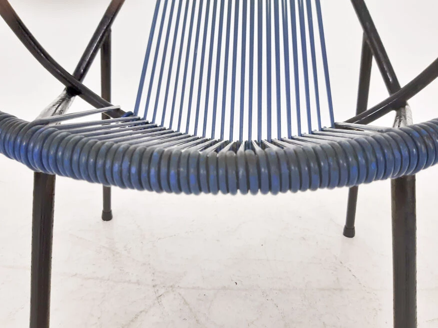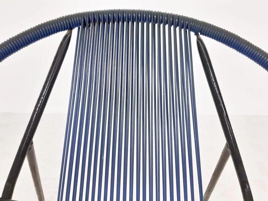 Cadre en métal noir avec sièges et dos en plastique bleu.