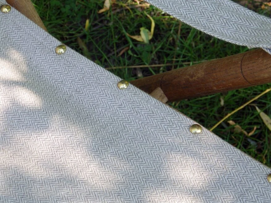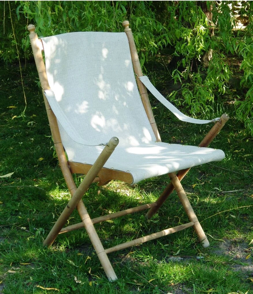 Chaise pliante typique des meubles de jardin du second empire et de la belle-epoque, retapissée de lin à chevrons épais, couleur mastic (assise et dossier d’une seule pièce).