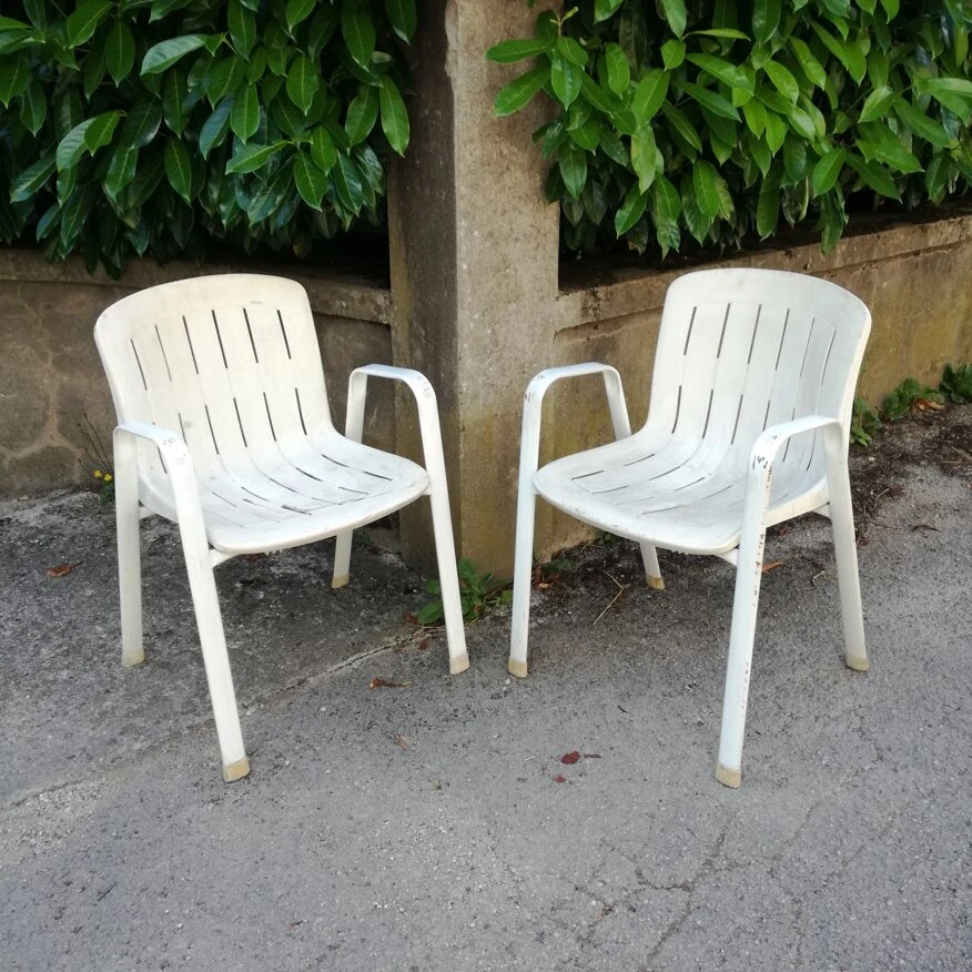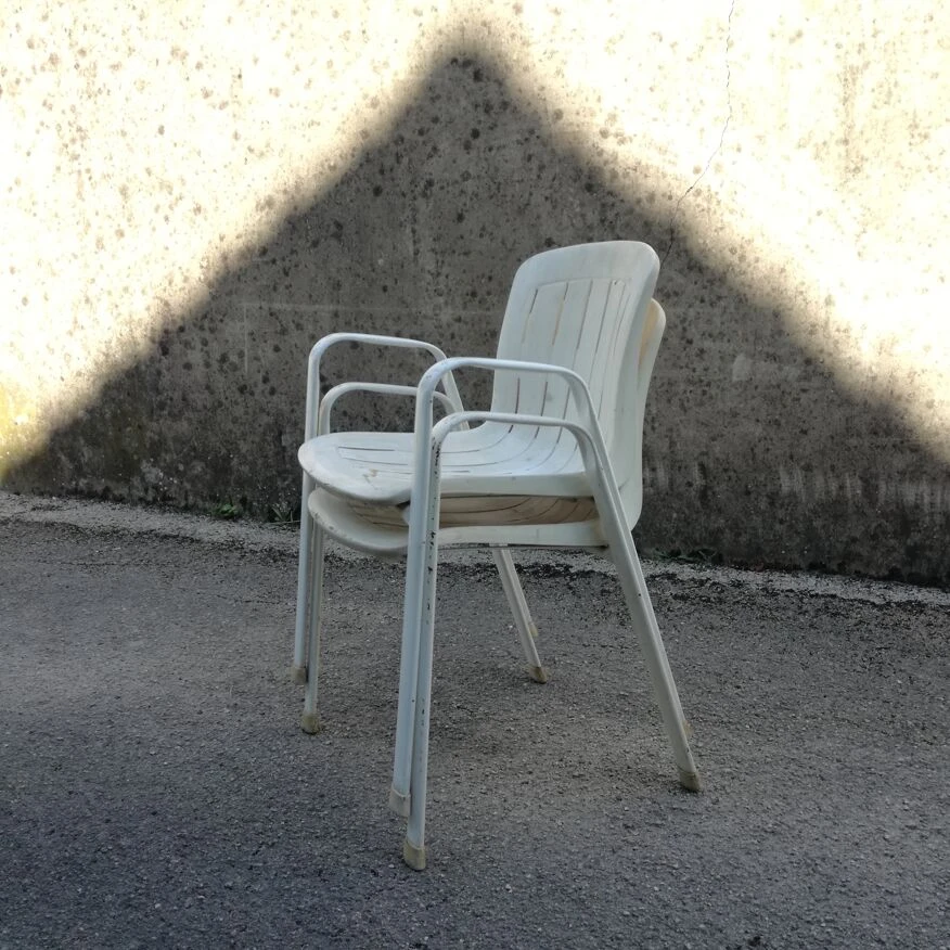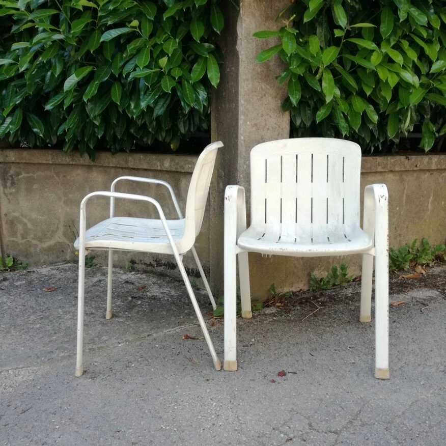Châssis en tubes peints et coques en plastique injecté – date de fabrication sous les assises (photos) – logo sur les dossiers – étiquette sur un exemplaire.