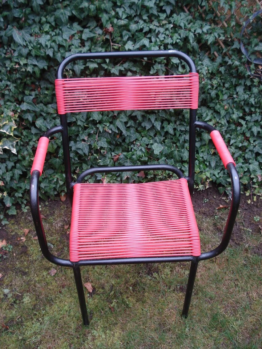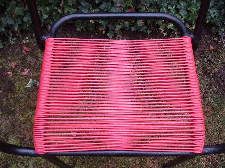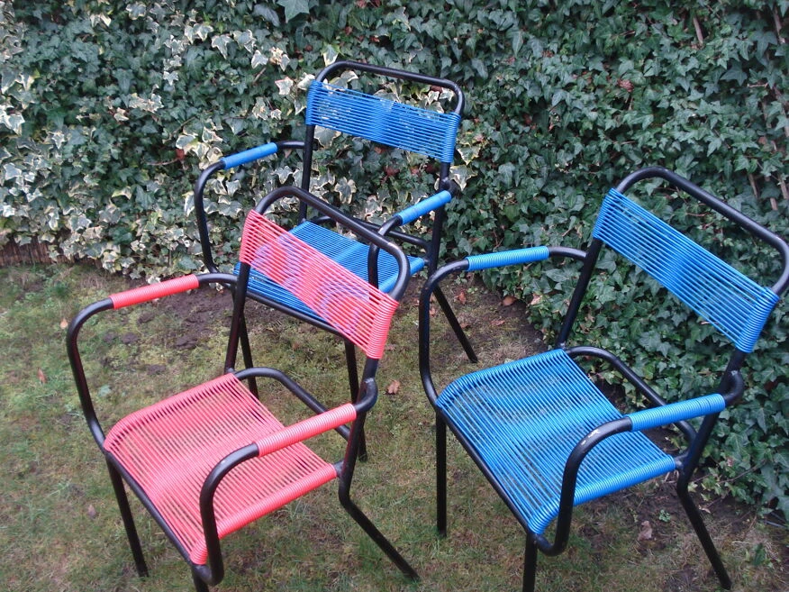 Bel ensemble de 3 fauteuils (1 bleu + 2 rouges) à structure métallique tubulaire noire et assise et dos en scoubidou.