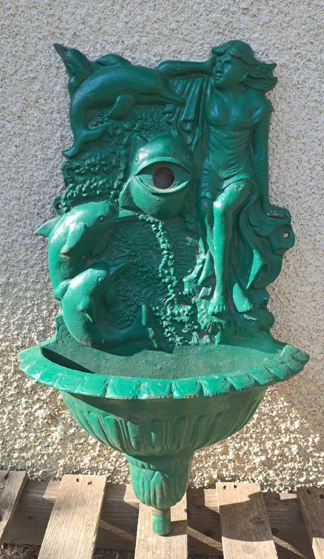 Fontaine en fonte, hauteur 63.5 cm, longueur 38 cm, profondeur 17 cm.